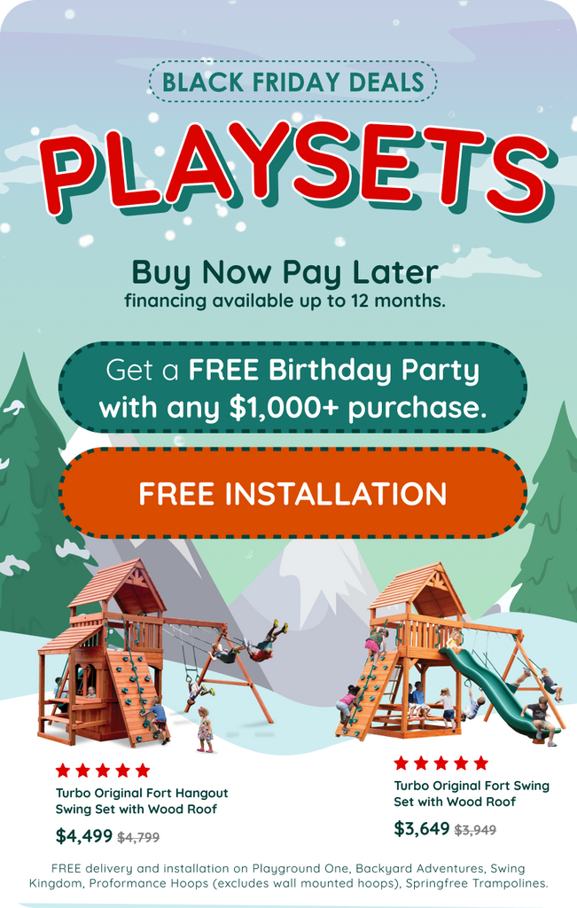 Transform your backyard effortlessly! Enjoy complimentary delivery and professional installation on all Playground One and Backyard Adventures playsets. Create a fun, safe, and exciting space for your kids — this exclusive offer won’t last long!Turbo Original Playcenter with Wood Roof Swing Set (19B)