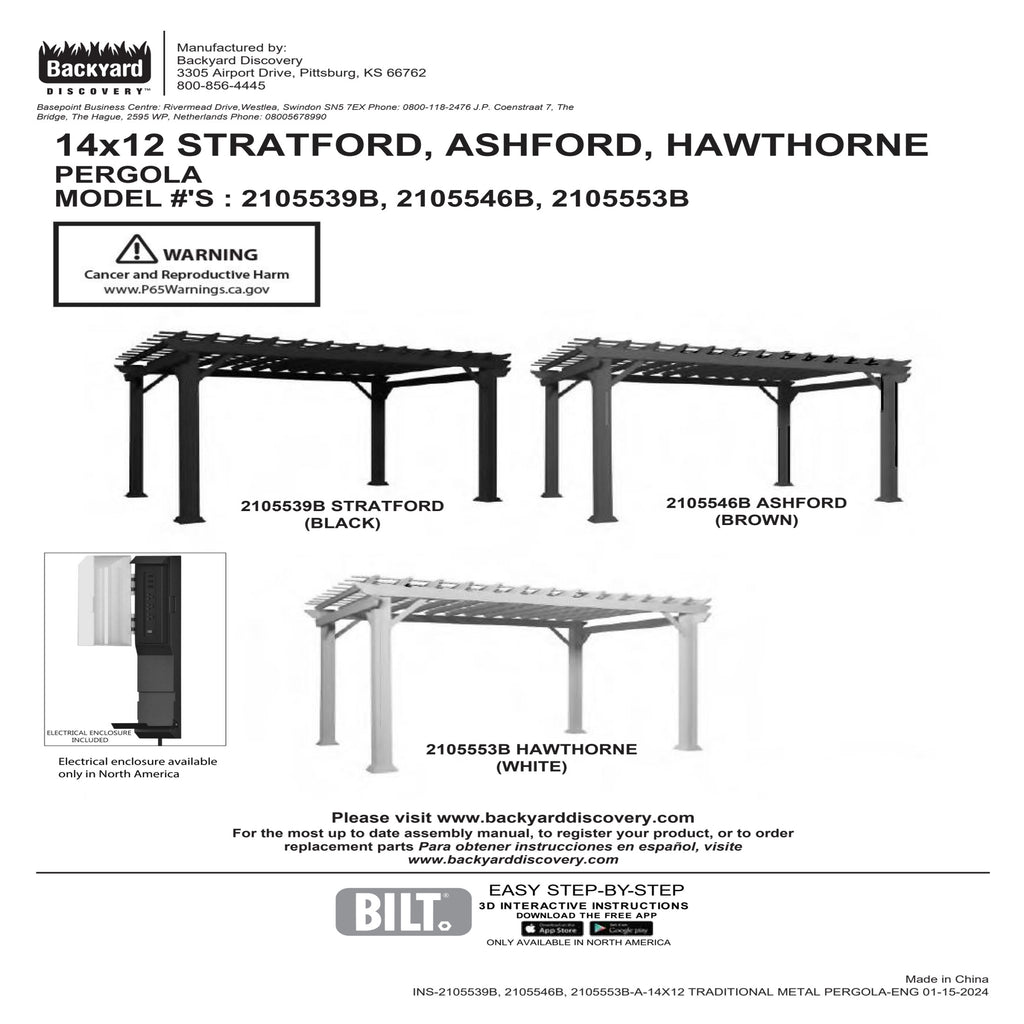 Traditional and timeless, the Stratford Steel Pergola by Backyard Discovery brings effortless charm to your outdoor living area. This stunning patio pergola combines enduring craftsmanship with modern sophistication, featuring a stylish black finish that creates a bold, striking aesthetic. Engineered with powder-coated galvanized steel, it delivers maintenance-free durability while providing superior protection against rust, chipping, corrosion, and UV damage. The elegant design provides plenty of shade with the integrated pergola canopy. This soft shade sail filters sunlight while offering protection from the elements, creating the ideal balance of shelter and ambiance. Pro-Tect™ tested and proven to withstand winds up to 100 mph*, this outdoor metal pergola stands strong through adverse weather conditions. Its generous size provides plenty of room for furniture, fire pits, and outdoor décor to create the perfect space for gatherings or simply relaxing. The patented PowerPort™ features three electrical outlets and three USB ports, making it easy to power your outdoor entertainment needs. This ready-to-assemble backyard pergola kit offers step-by-step guidance with the BILT® app, for easier installation. Backed by a 5-year warranty, the Stratford Pergola outperforms traditional aluminum and vinyl alternatives, delivering superior strength and style that will enhance your outdoor living for years to come.
