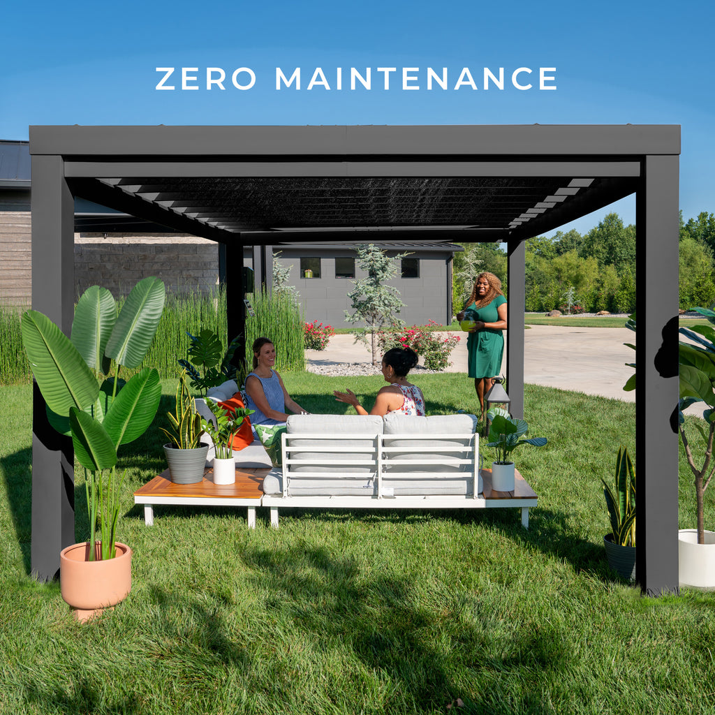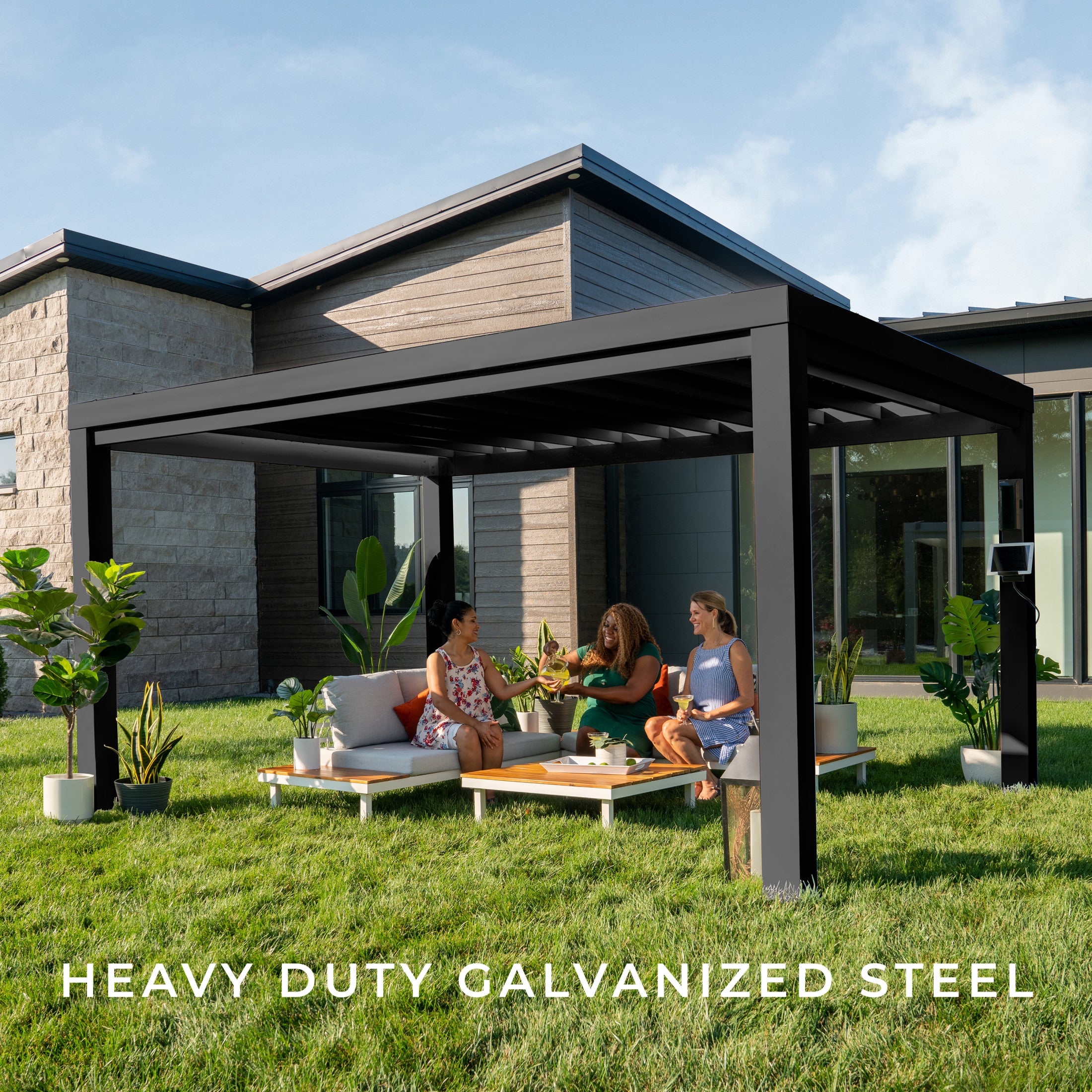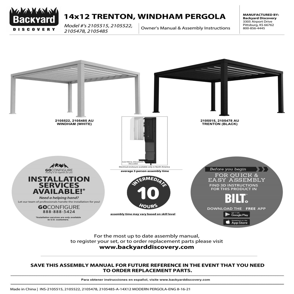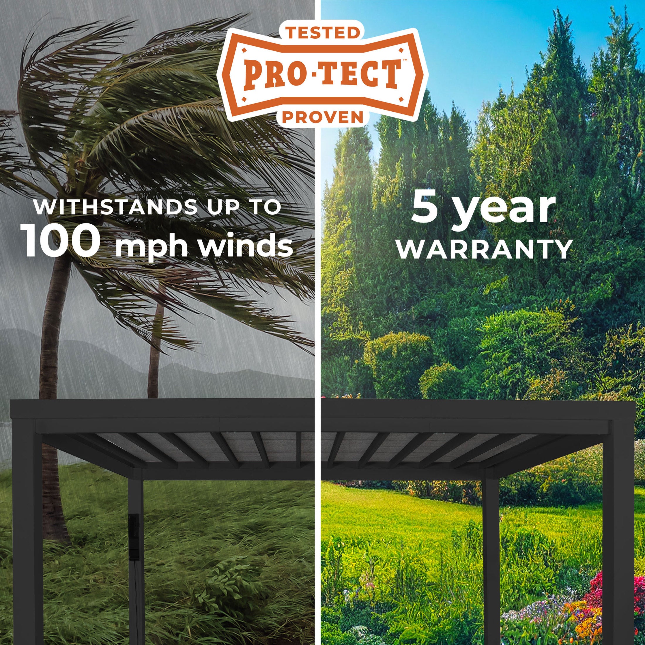 The Trenton Pergola by Backyard Discovery brings all-weather durability and beautiful style to effortlessly elevate your outdoor living space. Built with heavy-duty, powder-coated galvanized steel, this patio pergola is not only Pro-Tect™ tested and proven to endure wind speeds up to 100 mph* but is also maintenance-free with resistance to chipping, scratching, and corrosion. It comes with a soft shade sail canopy that’s crafted from durable woven fabric, allowing sunlight and air to filter through while providing UV protection for a breezy and comfortable environment. Its sleek black finish delivers a contemporary aesthetic that's perfect for creating a stylish centerpiece in your patio or deck area. This modern pergola offers endless possibilities to customize your retreat with plenty of space for comfortable furniture, fire pits, outdoor décor, and more. With integrated PowerPort™ electrical outlets and USB ports, you can easily add ambient lighting and power your entertainment needs, perfect for both quiet evenings and lively gatherings. This ready-to-assemble backyard pergola kit comes with prefabricated components and guided support through the interactive BILT® app for easier installation. Backed by a comprehensive 5-year warranty, the Trenton Steel Pergola transforms your backyard into an elegant retreat that combines modern sophistication with practical durability.