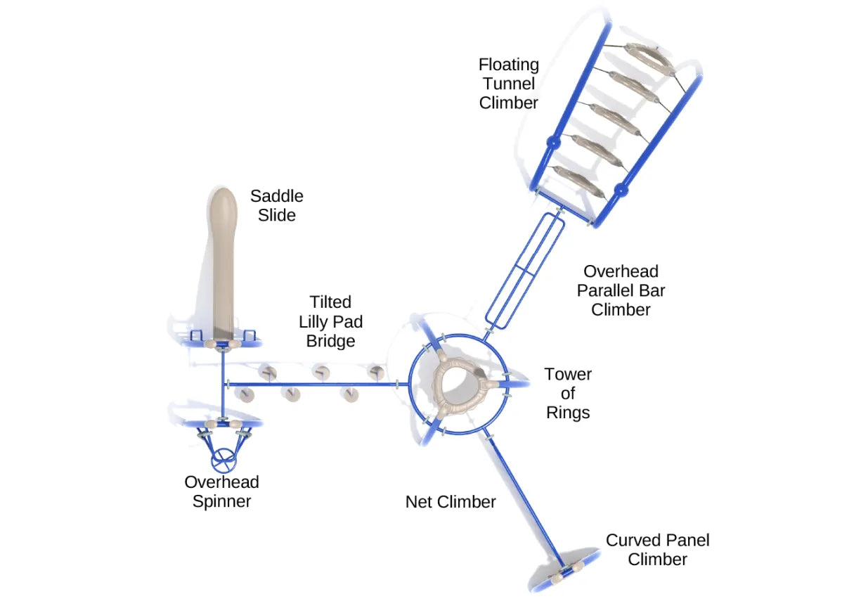 The Altamonte Springs is a modern and dynamic structure standing like a moonbase ready to be explored. It can be installed in any school playground or public space to bring joy to thousands of children over the years. Kids will soon work out how to shuffle their bodies through the five rings of the Floating Tunnel Climber before tackling the Overhead Parallel Bar Climber which requires a decent amount of upper body strength. A central Tower of Rings emerges from the center and there’s a Net Climber which can be used on both sides at the same time, leading to a Curved Panel Climber with lots of holes for feet and hands to grab hold of. A Tilted Lily Pad Bridge adds a new element to playground fun as children must alternate from left to right as they cross which helps balance and coordination skills. At the end of the course, kids can choose to either whizz down the Saddle Slide and stay upright, or opt for the Overhead Spinner and fling themselves around until they’re dizzy.