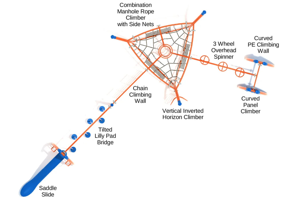 Whether it’s developing their sense of balance by sliding down the Saddle Slide while remaining upright or building upper body strength and agility on the Chain Climbing Wall, the Alverstone presents a unique opportunity to incorporate physical activity with immense amounts of fun. Children will be able to learn how to control their bodies and motor skills on play modules like the Combination Manhole Rope Climber with Side Nets and there’s no limit to the number of imaginative games that can be played. There’s a Curved Climbing Wall and Curved Panel Climber on one side that encourage children to build confidence and reach for the top before heading across the tricky 3 Wheel Overhead Spinner. A unique feature of this structure is the Vertical Inverted Horizon Climber which gives access to the upper nets. One feature every child will love to try and master is the Tilted Lily Pad Bridge which requires a careful balance of hand and foot movements to reach the other side.