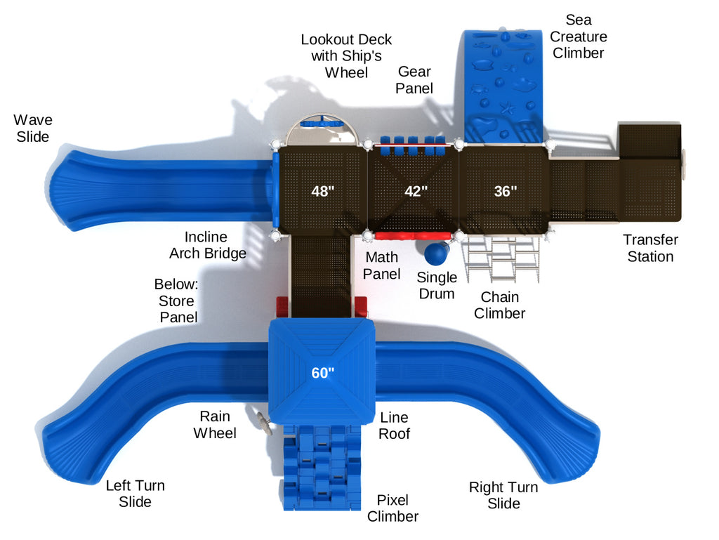 Children can never have enough of slides and ladders. The Amarillo Play Structure was designed with that in mind. It has three climbers: a plastic Sea Creature Climber, a metal Chain Climber, and a 6-ft Pixel Climber, so every ride to the top feels exciting. The ride to the ground is also fun, thanks to the 4-ft Wave Slide and two 6-ft Turn Slides that keep kids coming back for more. Amarillo’s transfer station is positioned at a low height to make the play structure welcoming for kids regardless of their disabilities. Once the children reach the transfer station, the playground set gets taller and more challenging. Many activities await them along the way, like the bright gear panel and the Half Math Panel, where they can challenge their friends to solve a puzzle. They can also steer an imaginary ship by taking control of the Ship’s Wheel. There’s also a concealed store panel where they can play more fun games.