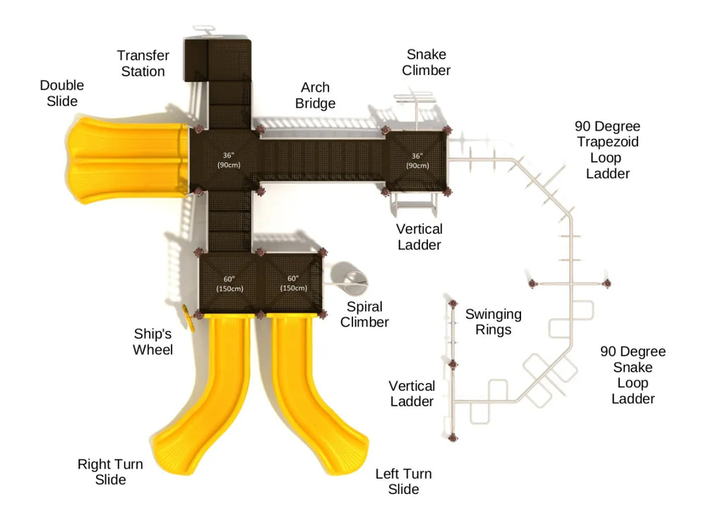 Adventurous older children will appreciate the variety in this Appleton playground equipment which provides active stimulation in the form of multiple sets of monkey bars. Watch them swing and grab their way to the end of the course whether they start from the Vertical Ladder and progress along the difficult 90 Degree Snake Loop Ladder and then tackle the 90 Degree Trapezoid Loop Ladder immediately after it, or start by climbing the Snake Climber to the small square platform. For kids with lots of energy and a decent amount of gymnastic ability there’s a set of swinging rings to build those upper body shoulder and arm muscles. On the structure itself there’s a reward for all that swinging. They can choose from a Right Turn Slide or a Left Turn Slide, and there’s even a Double Slide to race down with a friend. The Arch Bridge provides a fun change of footing as they move up and over it, and the set benefits from both a Spiral Climber and a Ship’s Wheel.