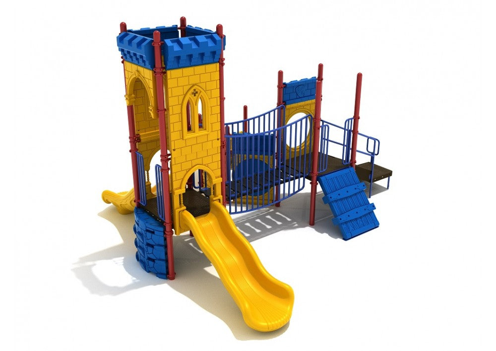 Avalon Island is a play structure teeming with engaging play amenities that will captivate any child. Its vibrant colors and diverse features are sure to bring joy to young adventurers. At ground level, kids can explore the sensory experiences of the Drum Panel and Gear Panel, each offering unique ways to play. The Bench Panel provides a convenient spot for rest, while the Store Panel acts as a portal to imaginative worlds. Children can ascend via the Draw Bridge Climber, the Castle Rock Wall Climber, or the stairs to reach Avalon Island's elevated area. From there, they can traverse the Suspension Bridge and choose between two slides for a thrilling descent.