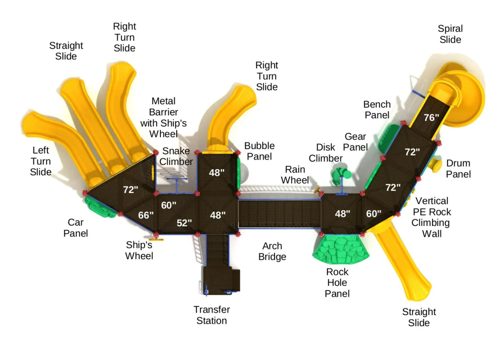 Everything about the massive Bakers Ferry play structure is designed to foster creativity and improve physical fitness through play. Six slides provide ample opportunity to reach dizzying speeds, with one Right Turn Slide, one Straight Slide and one curvy swervy Spiral Slide coming from the platform. In addition to these there’s also an amazing way for three children to race each other thanks to a cluster of Left, Right and Straight slides right next to each other. While there is a Transfer Station for easy access, kids will be drawn to the more difficult options. These include a Rock Hole Panel that mimics a rock face, a Vertical Rock Climbing Walls for a real challenge, a Disk Climber with multiple circular steps, and a Snake Climber for innovative climbing and motor skill development. The sections are tied together with a curved Arch Bridge and on the bottom level children can get creative with a Car Panel for pretend vehicle fun, a Gear Panel for twisting movements, a Drum Panel to make sound with and a Bench Panel for when it all gets too much. There’s also a Rain Wheel to make the pitter patter sound of precipitation, a Ship’s Wheel to emulate a ship’s captain or submarine commander, plus a Bubble Panel to explore outer space in a rocket or a deep sea adventure.