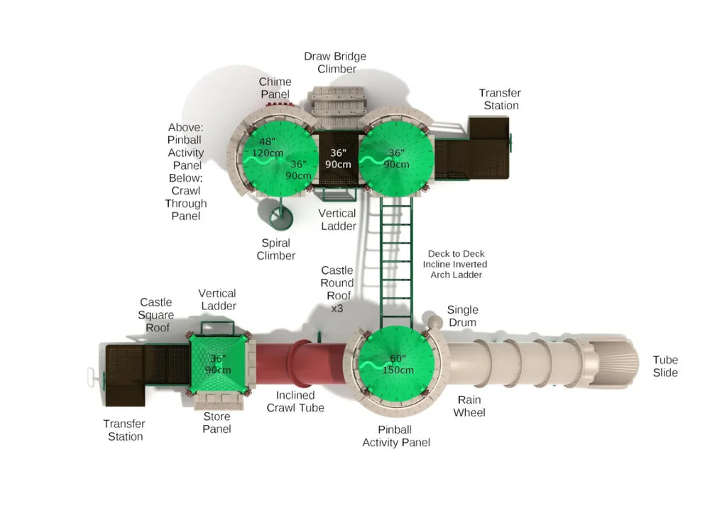The Banneret Borough is a large and tall structure that pulls children towards your playground. Although it has an exciting appearance, it also promises an unforgettable play session. At the ground level, kids can discover new tunes at the Single Drum. Or, they could take command of their imaginary ship at the Rain Wheel and steer it clear of any sea rocks. The Banneret Borough is also perfect for hot days because the Crawl Through Panel offers a cozy, shaded resting spot away from the sun. The structure comes with three climbers that children can take to reach the elevated area. It has vertical ladders for a simple way to the top. The Spiral Climber and the Draw Bridge Climber are for those who love a challenge. At the top, there’s a lot more to explore, including the Chime Panel and the Pinball Activity Panel. When it is time to leave, kids can zoom down via the attached Tube Slide.