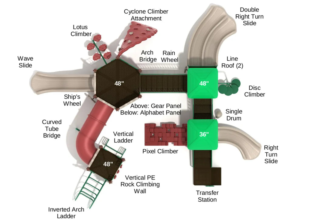 Staying fit and healthy has never been so much fun for kids when they have the Baraboo play set in their playground or local park. The activities on this play center are designed to make kids use different muscles and cognitive abilities which enhances the play experience. The Cyclone Climber Attachment, for example, requires kids to not only find grips with their hands and feet but also hold their balance as it twists around. The Lotus Climber needs to be climbed by coordinating hands and feet, and the Pixel Climber and Vertical Rock Climbing Wall both require precise movements and holding the weight of the body off the ground. From the central hexagon deck kids can crawl their way through a Curved Tube Bridge to get to an Inverted Arch Ladder, or in the other direction they can cross the Arch Bridge to discover a Double Right Turn Slide and a single Right Turn Slide. A Gear Panel and Alphabet Panel can also be found on the structure to inspire creativity and boost early learning skill.