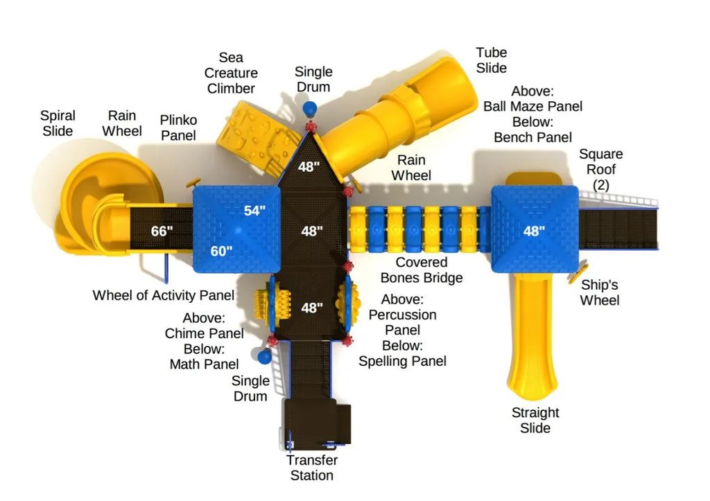 It won’t be an exaggeration to call Barrington Ridge a cheerful city of slides, musical equipment and especially activity panels. Two of the three ways leading to the bridge are staircases designed to be accessible to all children. But if kids are looking for a challenge from the onset, they can climb through the ocean-themed Sea Creature Climber. Once on the top, two slides of the same elevation, a Tube Slide and a Straight Slide, are ready to offer them fast but distinct experiences. Kids with no fear of heights can try the 66-inch deck tall Spiral Slide and get a 360-degree view of the playground on their way down. Connecting all these rides is the colorful Covered Bones Bridge with a roof overhead, ensuring the entire Barrington Ridge remains under shade. A good number of kids will be glued to the Chime, Percussion, Plinko, and Wheel of Activity Panel on the top. The rest you will find playing with Math and Spelling Panels or Wheels and Drums tucked underneath the slides.