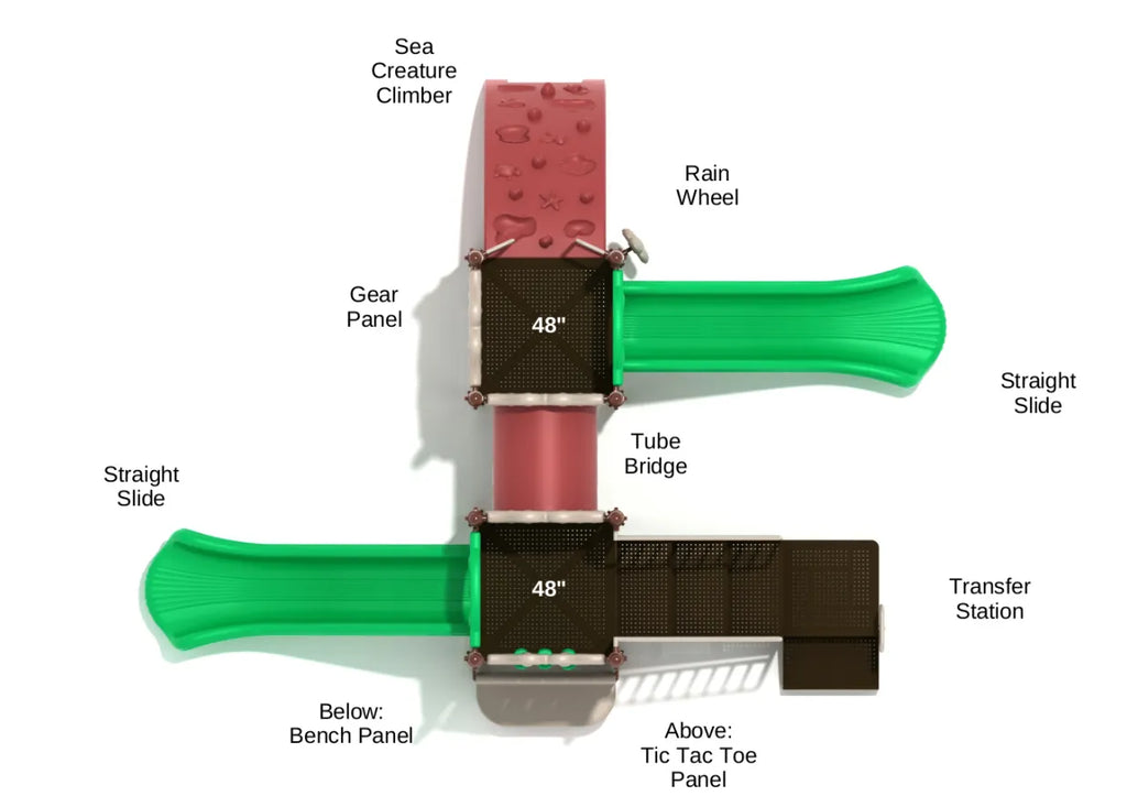 With so many features extending from the structure children are spoiled for choice when deciding what to do first. They can opt to climb straight up and whizz down either of the Straight Slides or have a friendly game of Tic Tac Toe with a friend to develop important problem-solving skills. There’s nothing more adventurous than climbing through the Tube Bridge which is lifted off the ground to connect the two upper platforms. It’s a fun structure to climb through but children will also like to hang out there pretending it’s a cave or secret passageway. For children who need a challenge, the Sea Creature Climber is sure to be a favorite way to climb aboard the Berkeley structure, using jellyfish and turtles to work their way up and over the curve. A Gear Panel adds interest and displays basic mechanisms for children and there’s a Rain Wheel that makes a sound like rain pouring down. For children who just want to sit quietly with a friend or enjoy a story, there’s an end Bench Panel too.