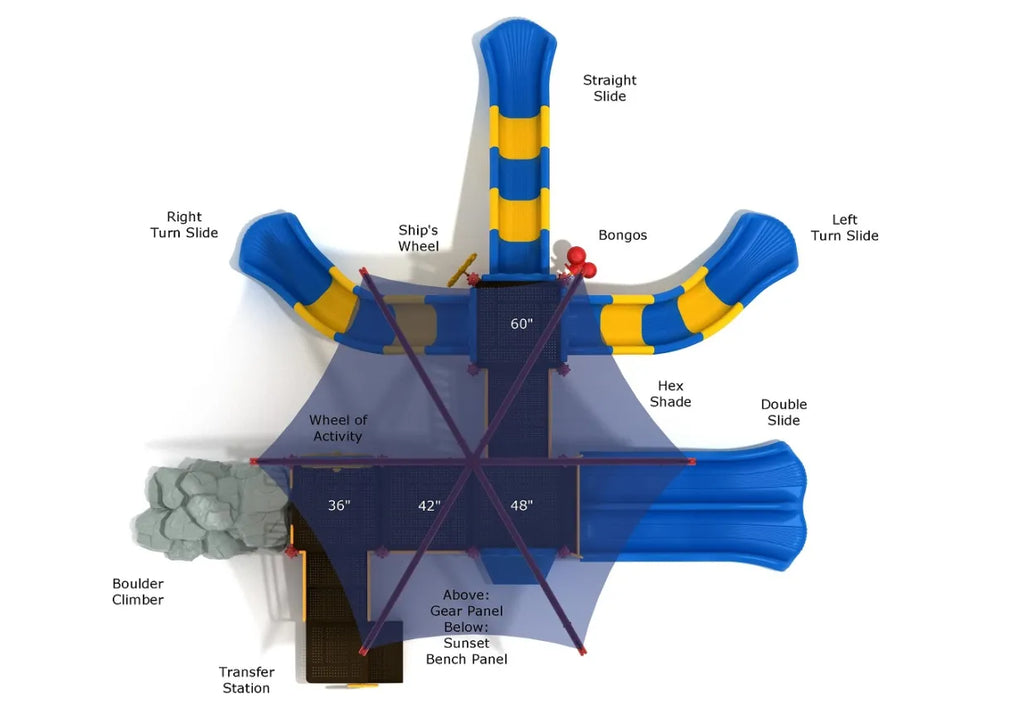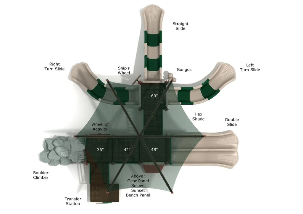 Kids can start their journey by scaling the Boulder Climber or taking the Transfer Station to reach new heights. At the top, the Gear Panel and Wheel of Activity provide hands-on fun, encouraging curiosity and teamwork.