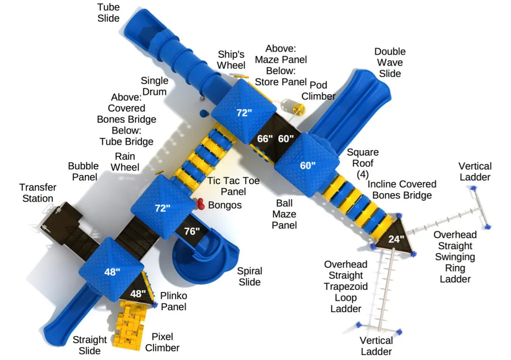 On Boardwalk Place, there’s limitless fun but with a great focus on adventure. The L-shaped setup has unique ways to climb it from both ends. On one end, there is a traditional staircase and a Pixel Climber facing it, offering a simple to a little challenging climb up the deck. On the other end, two types of Overhead Ladders are suspended in the air, inviting daring kids to test their skills. Once they’ve made it to the deck from any end, the rest of the Boardwalk Place is all fun and games. There’s the ever-popular Double Wave Slide, perfect for racing down with a friend. Then there’s the enclosed Tube Slide with faster speed, close to the even Taller Spiral Slide. The classic Straight Slide also offers a quick ride down. In between these slides, there are multiple activity panels that combine gaming and learning. A long Tube Bridge neatly tucked