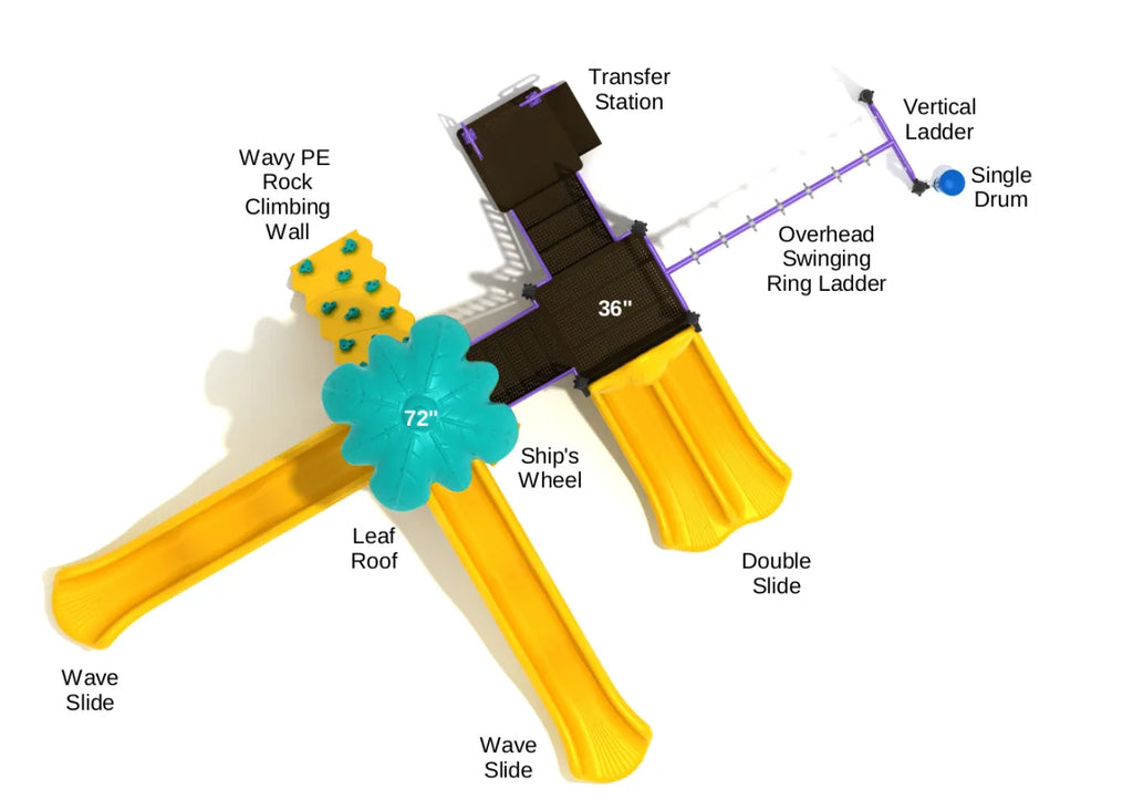 Fuel the imagination of young minds with the Boise play set as there are a plethora of features to keep children happy. With two long and bumpy Wave Slides which seem like they’re slipping down a waterfall, and a short Double Slide ideal for racing, kids can slide and glide all day long and will love to race back to the top to do it all again. They can get back up again in various imaginative ways such as using the Overhead Swinging Ring Ladder to build upper body strength while swinging across jungle vines, scramble up a mountainside on the Wavy Rock Climbing Wall, or use the Transfer Station to enter the play set. There’s a Ship’s Wheel located under the Leaf Roof for imaginative play sailing across blue oceans or blasting off into outer space. As there’s lots to do, the Boise set keeps multiple children occupied at the same time so there’s no long waits to use certain features of the play center. There’s even a Single Drum for fun music-making activities.