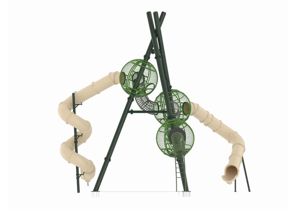 Bouncing Battlement is an invigorating playground structure composed of interconnected spheres built from a sturdy wire mesh system. Each sphere, differing in height and placement, creates unlimited opportunities for children to dive into imaginative play, navigating through multilevel tunnel slides. The climbing components thoughtfully interspersed among the spheres not only enable easy transitions between different play areas but also actively promote the development of children’s motor skills. The bright and appealing colors of Bouncing Battlement draw children into a world of fun, while its open-framework design gently acclimates them to various heights within a safe and unrestricted space. Bouncing Battlement offers a fun-filled and growth-oriented play experience suitable for kids across all age groups.