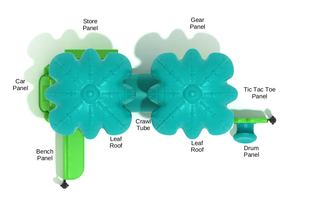 As the Bozeman is all on one ground level it’s perfect for very young children who might have difficulty navigating steps and ladders. There’s still a lot of fun to be had on this equipment though as children can use the Crawl Tube to get from one side to the other, and there’ small holes perfect for peeking out of. The potential for imaginative play on the Bozeman is endless as there are multiple role-playing panels. There’s a Car Panel with a 3D car on one side and a funny flower steering wheel on the other side which can be spun. Children can drive this car to the adjacent Store Panel where a shopkeeper can be waiting to sell them some fresh produce or even a new pet. There’s a Gear Panel which can be interacted with as the cogs spin wildly inside, and a Tic Tac Toe Panel that introduces children to strategic gameplay. All of this fun and excitement is topped off by two Leaf Roofs on tall trunk-like posts so children can pretend they are in a jungle setting when sitting on the Bench Panel.