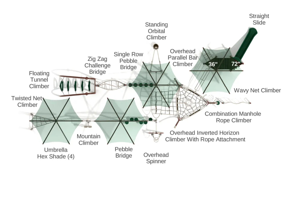 With 4 Umbrella Hex Shades and 4.5 inches in diameter, Brasstown Bald is as majestic as the eponymous mountain. It has a Twisted Net Climber with swaying ropes that provide a thrilling climbing experience for kids. Navigating its challenging design helps kids build their upper body strength. There’s a Floating Tunnel Climber that will let kids climb through suspended hoops confidently. Kids can engage in all sorts of friendly competitions like who gets to the other side first without touching the ground. The Pebble Bridge is a mushroom-step structure that lets kids practice their balancing skills as if they’re martial arts trainees. Brasstown Bald also features a Standing Orbital Climber that lets kids rotate each other. As they take turns, it shows them the power of teamwork. The Mountain Climber and the Combination Manhole Rope Climber create exciting physical hurdles for young adventurers. The Brasstown Bald play structure also boosts kids’ spatial awareness while they’re busy having fun.