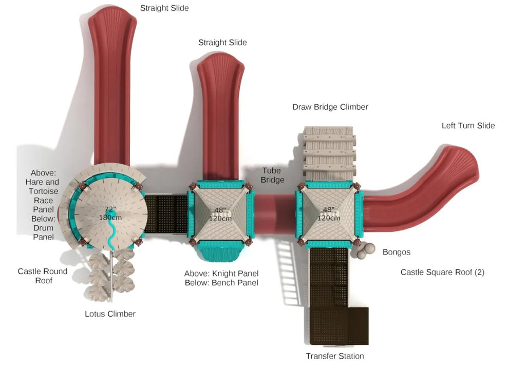 Our Castle Series of play structures have been a hit, and Bravery Helm is no different. It has a special place inside every child’s heart because of the numerous fun activities it offers. Unlike other play structures, this one ignites both excitement and imagination. Thanks to its unique appearance, kids will feel like they are rulers of their own castle. To begin the fun, Bongos and Drum Panel are a good starting point. Here, they can create new musical tunes with their friends. The Bench Panel provides a place to rest before they head upwards via the Lotus Climber or the Draw Bridge Climber. There’s so much to do at the top as every area leads to a new surprise. Children can play at the Hare and Tortoise Racing Panel or take the Tube Bridge to get to the other side. Also, the Bravery Helm has three fun slides that offer a fantastic way back to the ground!