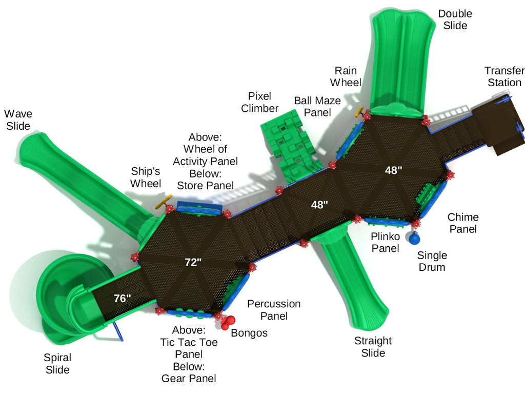 Children will be thankful for every opportunity they get to play on the Brindlewood Beach whether it’s located in their park for public use or installed in a school playground. The only decision they’ll have is what to play on first, as the play equipment has so much happening to draw their attention. Two main hexagon decks are where the magic happens, with a lower deck boasting both a Wave Slide as well as a twisting Spiral Slide. There’s a Store Panel and Gear Panel on the ground level, as well as a Ship’s Wheel and Bongos to bang. On the platform there’s a Tic Tac Toe Panel for a quick game or two, and a Wheel of Activity Panel for when they simply can’t decide what fun thing to do next. Leading up to the upper deck there’s a playful Pixel Climber and a Straight Slide, but once they reach the top deck they can enjoy a Plinko Panel and Ball Maze Panel, both interactive. There’s also a Chime Panel and Double Slide to race down on their own or with a friend.