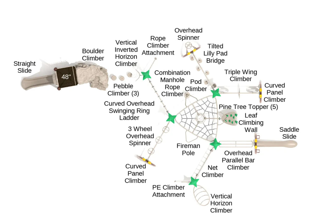 Five Pine Tree Toppers set the scene for a woodland adventure. Children can get out into nature and explore a variety of nets and climbers emerging from a central Combination Manhole Rope Climber. They’ll find fun in whichever direction they head off in, whether it’s climbing into the treetops on a Leaf Climbing Wall, using the Net Climber to reach the Vertical Horizon Climber or choosing the Overhead Parallel Bar Climber to slide down a long Saddle Slide which sits like a fallen tree in the forest. Heading in the other direction they can master the 3 Wheel Overhead Spinner and climb the Curved Panel Climber to get a good view of the whole apparatus. Crossing the Tilted Lily Pad Bridge brings kids to the Overhead Spinner where they can imagine they’re holding thick woodland branches as they spin themselves into a dizzying bliss. A Curved Overhead Swinging Ring Ladder unleashes their inner monkey as they make their way to the Vertical Inverted Horizon Climber, skip across the Pebble Climber platforms, and scale the Boulder Climber before heading down the Straight Slide waterfall.