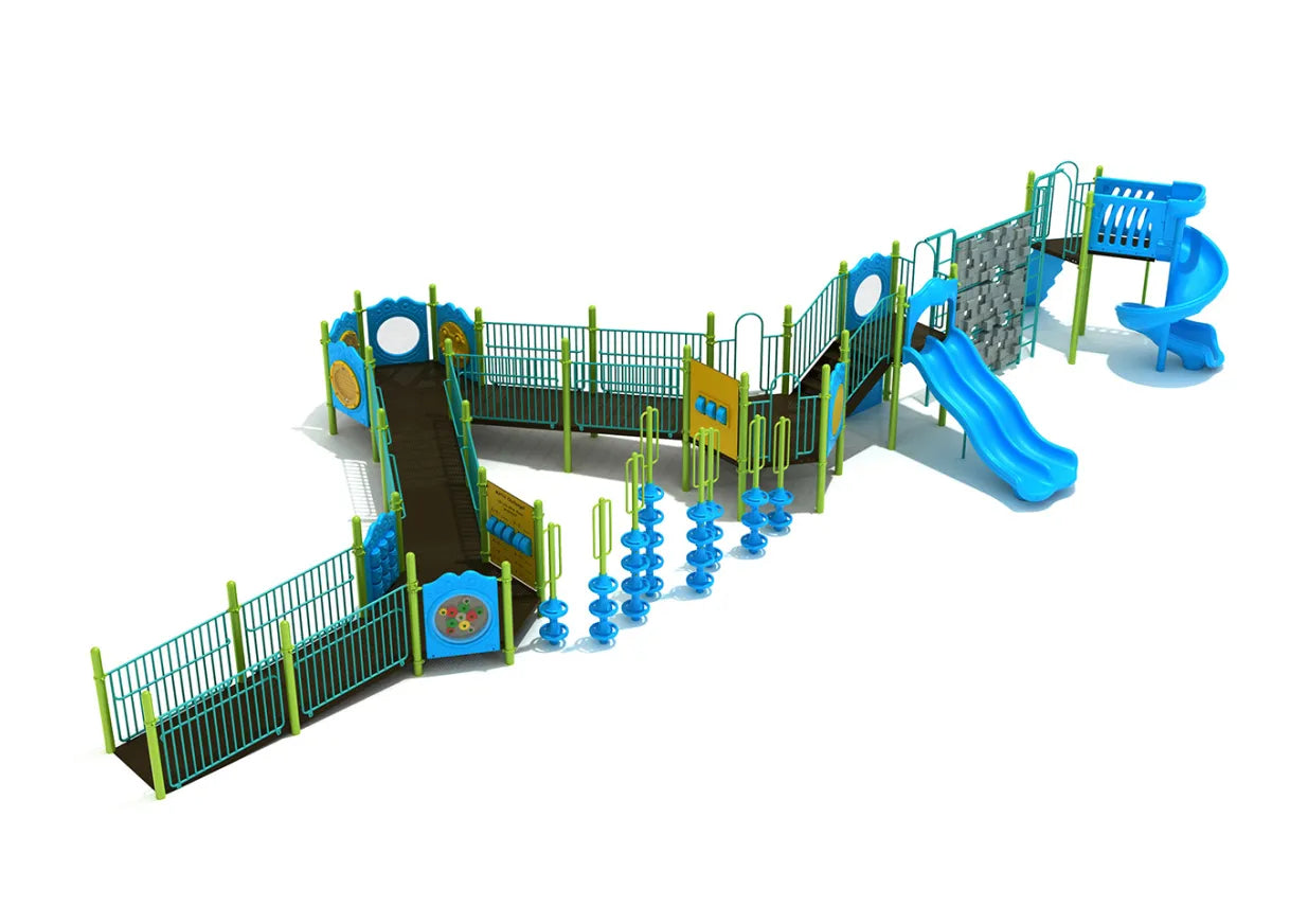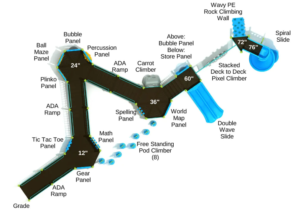 The main Caprock Canyons structure is composed of three ADA Ramps connecting three hexagonal platforms so that children using mobility aids or wheelchairs, or those who have difficulty navigating stairs, are able to fully enjoy everything on offer. Multiple interactive panels line the ADA Ramps including a Plinko Panel and Ball Maze Panel which can be activated by spinning the outer edge of the wheel panel. A Percussion Panel lets children bang on drums whichever side of the panel they use and there’s also a Spelling Panel and a World Map Panel to educate. On the other side of the structure there are 8 Free Standing Pod Climbers so children can work their way from platform to platform without touching the ground before going down the Double Wave Slide. After crossing the challenging Stacked Deck to Deck Pixel Climber featuring cubed hand and foot holds, kids can whizz down the Spiral Slide. There’s also a Carrot Climber to use as well as a Wavy Rock Climbing Wall with different positions of holds for children to discover.