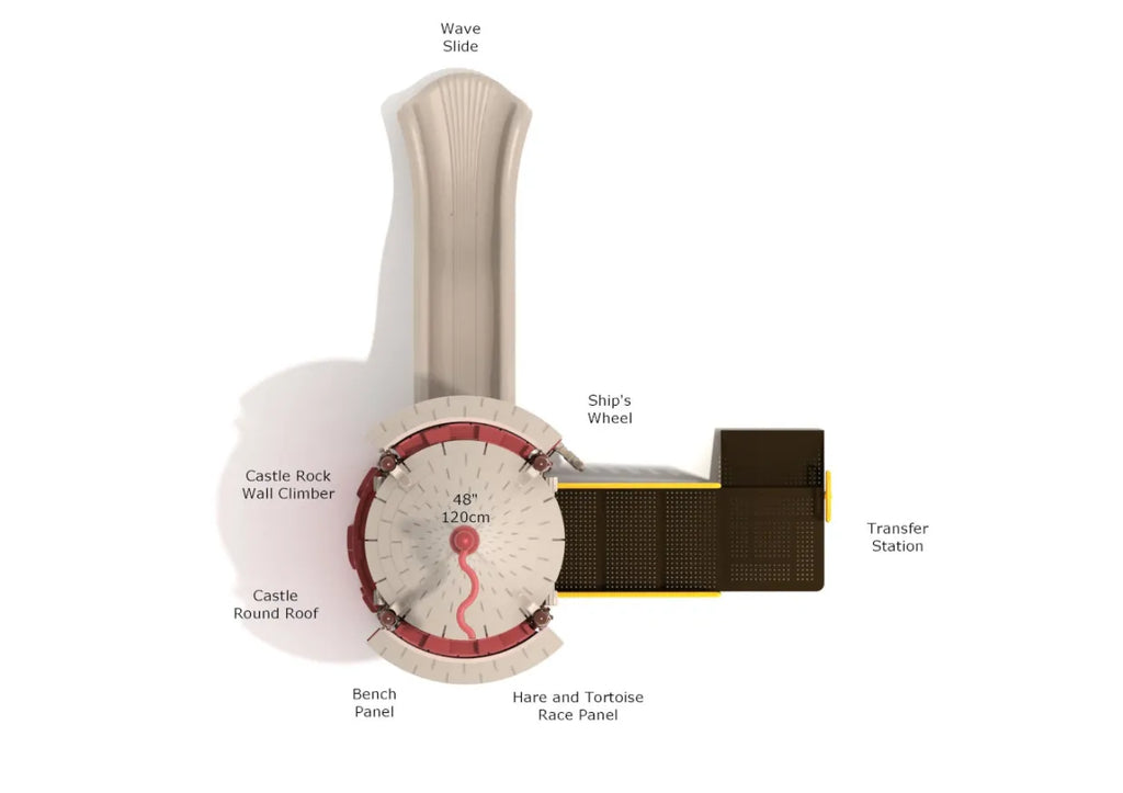 The Chancellor's Chamber is an all-in-one playground setup that’s compact in size but big on fun. Even without a grand footprint, the playset manages to pull kids from afar with its castle-themed roof and walls. Right at the base of the play structure, kids can take charge of the Ship’s Wheel and take an imaginary ship out of rough seas. When it’s time to join the fun above, kids can either use the Transfer Station stairway or make their way up through the Castle Rock Wall Climber. The Transfer Station is good for kids of all ages and abilities, while the Rock Wall Climber is an outlet for the daring ones to flex their skills. There’s some more hands-on fun up there. The Hare and Tortoise Racing Panel lets them witness the classic fable in real life. The real treat of the Chancellor's Chamber is the Wave Slide which takes kids on a bouncy ride down before landing them safely. On the ground level, kids will find a bench to rest in the shade before starting again.