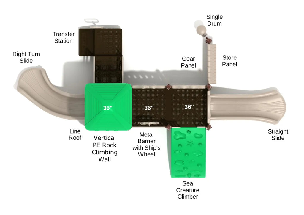 Specially designed to encourage physical activity and creative thinking for infants and toddlers aged up to 5 years, the Chapel Hill play equipment has lots to keep them engaged. Little hands and feet will love to scale the fun and friendly Sea Creature Climber featuring animals from under the sea to grab hold of. For a more rewarding climb they can choose the Vertical Rock Climbing Wall to reach the first platform under a Line Roof. From there they can choose to slip down the Right Turn Slide, use the Gear Panel, play sea captain or pirates on the Metal Barrier with Ship’s Wheel or even use the Straight Slide at the end of the structure to reach the ground quickly. The lower level has lots to inspire young minds and a Single Drum is available for an impromptu percussion session. The Store Panel is the perfect addition for young children who enjoy role playing, selling and buying things from their friends to bring lots of joy.