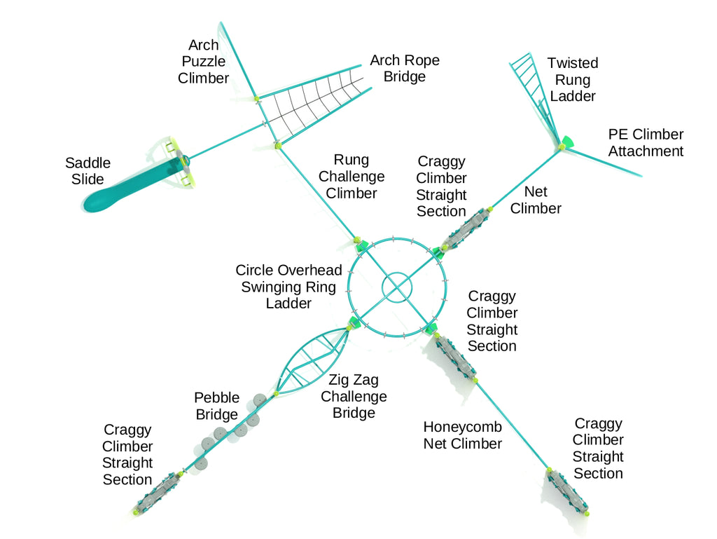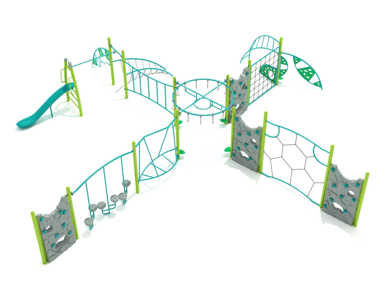 What’s great about the Columbia Hills outdoor play structure is that the 15 components all cater for children of different ages from 5-year-olds just developing a love of the playground to 12-year-olds who need more challenge from play equipment. There are 3 Craggy Climber Straight Sections which give a real rock climbing wall experience to children, and the Climber Attachment and Arch Puzzle Climber change things up with their unique structure. Numerous climbing nets like the Arch Rope Bridge, Net Climber and Honeycomb Net Climber let children climb at their own pace whether they want to play a game with friends or discover on their own. A huge Circle Overhead Swinging Ring Ladder connects with a Rung Challenge Climber and Zig Zag Challenge Bridge so children will be able to give a workout to all parts of their body. The Saddle Slide will be popular with kids wanting to ride it again and again, and a Twisted Rung Ladder makes children think how they will tackle it in multiple dimensions.