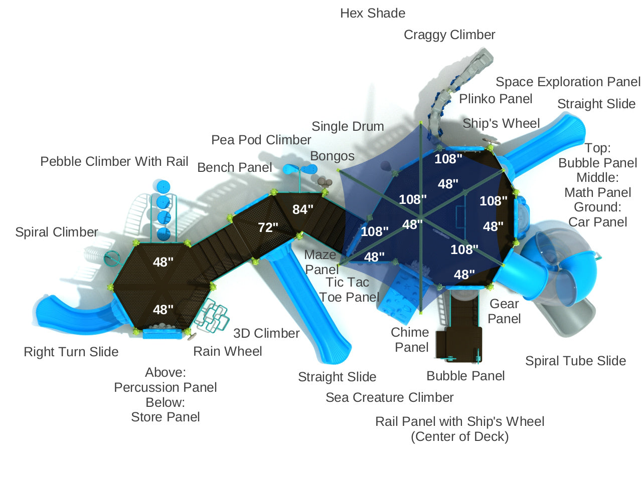 This play structure resembles a megacity of fun for kids with different slides, climbers, decks, & panels. On top of Concord Station, children can chase a never-ending fun ride. This metropolis can be accessed via Spiral and Craggy Climbers. After climbing these rocky cliffs, agile kids return to the ground via a Spiral Tube Slide. A 3-story shaded tower serves as the central feature of Concord Station. Kids can play underneath it when it’s too sunny outside. They can easily reach the upper levels by climbing on different steps that promote physical activity and boost their coordination skills. The Sea Creature Climber has animal-shaped handholds to serve as the perfect setting for an imaginative climbing experience. The Car Panel and the Ship’s Wheel allow kids to call upon their imagination while remaining grounded. Many pathways connect these slides and climbers, promoting exploration and curiosity, almost like finding their way out of a see-through maze. With 25 individual play components, it’s All Aboard as the Concord Train leaves the station.
