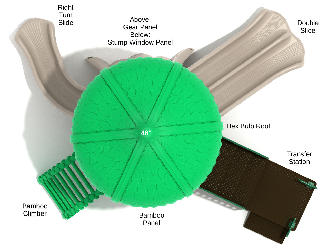 If you want kids to have their very own treehouse in the playground, choose the Cougar Corral. All of the fun takes place beneath a large Hex Bulb Roof covered in leaves, making kids believe this is a treehouse high in the forest canopy. A Bamboo Climber is the perfect way to get up to the hexagonal platform as it looks like it’s been created from branches tied together with rope. A Bamboo Panel and Stump Window Panel both add to the woodland theme and kids can pretend they are part of a jungle village tribe with their friends. On the top level, there’s also a Gear Panel which kids can use to pretend they’re raising the ladder to the treehouse so nobody else can get inside. When it’s time to get down, the adventure continues with a Right Turn Slide as well as a Double Slide so friends can slip down together. The play structure is built with commercial-grade plastic and galvanized metal to ensure kids can play on it in any season of the year.