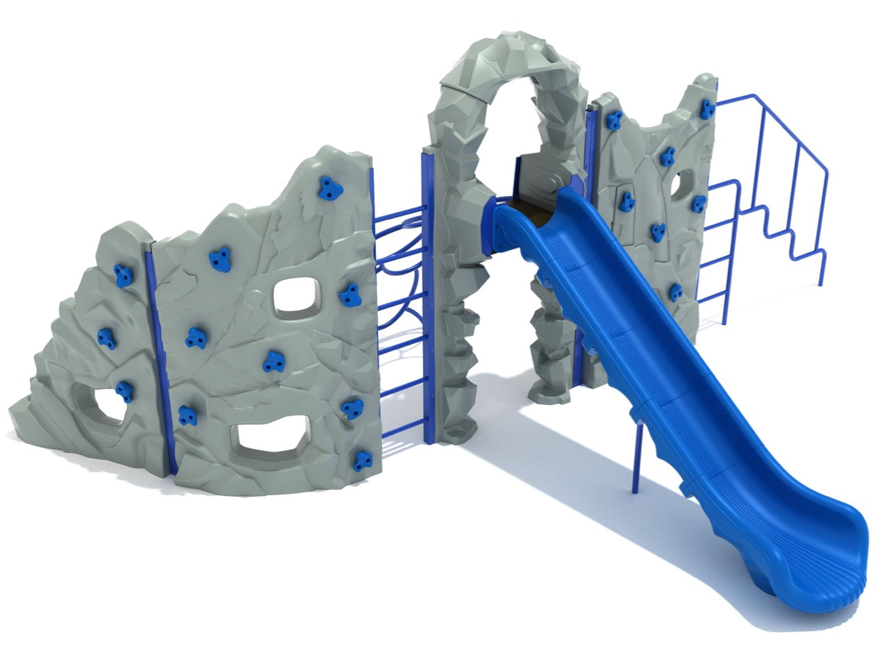 Not many elementary schools or public parks can boast an entire mountain range for children to play on but that’s exactly what the Craggy Summit delivers. It is an impressive piece of playground equipment that children will love to play on time and time again with so much to do. The Craggy Summit perfectly replicates the jagged gray rocks of a mountain and children can become young explorers as they tackle any of the three climbing walls which have holds that enable them to reach the summit. Children will be in their element as they scale the sides of this structure, building confidence as well as key physical development skills. There is a staggered end piece which matches the form of the mountains and children can use these poles to start their journey, moving from the top directly onto the climbing walls. The play equipment also boasts a huge slide that cascades like a waterfall from the rocky heights and it can only be reached by navigating the circular ladder which promotes a real sense of adventure. Underneath the structure there is a jagged rock cave which children will love running through in a range of creative scenarios.