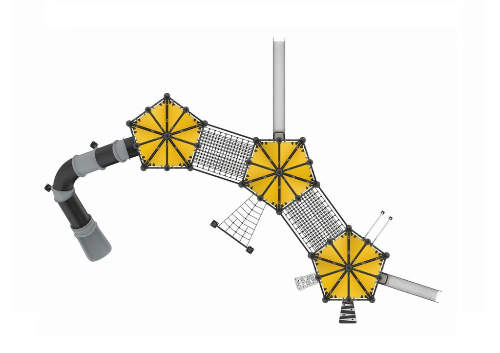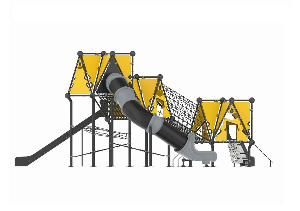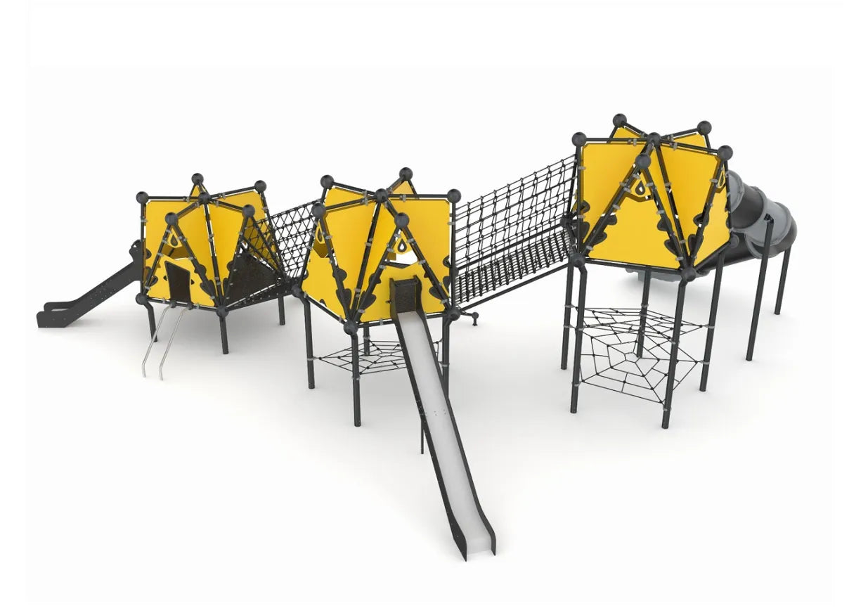 Creature's Campout, is an invigorating play structure that boasts diverse platforms shaped as triangles, squares, and pentagons. Each is intricately designed with varying difficulty levels to challenge and develop the motor skills of children aged 2-12. This innovative setup promotes physical growth and ignites a spirit of competition among the young adventurers. As they maneuver through the unique geometric shapes, children enhance their physical prowess and indulge in friendly competition. Creature's Campout provides an ideal playground for testing agility, balance, and coordination, offering a lively and engaging atmosphere. This play structure encourages children to embrace challenges and extend their capabilities, ensuring each playtime is both thrilling and growth-oriented.
