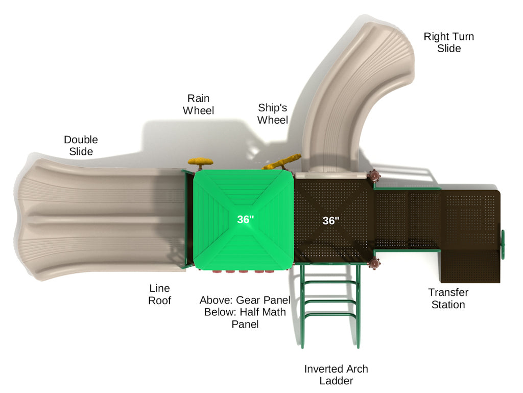 A Transfer Station is ideal for little hands and feet to climb up onto the deck and experience the fun of outdoor play equipment. It’s also suitable for less abled children who can’t manage to scale structures such as the Inverted Arch Ladder leading up to the deck. After successfully reaching the top, there’s a Gear Panel situated under a Line Roof to provide protection from the sun and rain. After turning the colorful cogs they can choose to head down the Right Turn Slide or grab a friend and whizz down the Double Slide together. Around the base of the structure kids can explore a Half Math Panel to practice basic numeracy skills and a Rain Wheel which can be spun around to make the sound of cascading water. The addition of a Ship’s Wheel opens up a world of activities on the Durango. They can be swashbuckling pirates headed towards a treasure island, or charting a yacht to somewhere tropical with dolphins playing in the water all around.
