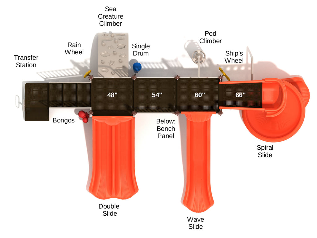 The linear design of the Durham makes it easy for children to access all parts of the equipment when they climb aboard at the Transfer Station. There are two other ways to get to the platforms. The Pod Climber lets them feel like they’re climbing up a palm tree or temple column with the rounded design, and the Sea Creature Climber brings excitement as they grab 3D starfish and turtles to help their ascent. The Durham boasts three fun slides to choose from: a Double Slide for thrilling competition, a Wave Slide for an undulating experience or a Spiral Slide for giggle-inducing twists and turns. On the ground level there is a Bench Panel to catch their breath from all of the excitement as well as a Ship’s Wheel to inspire creativity. The sound of music from the Bongos and Single Drum creates a happy atmosphere in the playground and younger children especially will love to bang their hands on these. A spinning Rain Wheel is also included to emulate the pitter patter of raindrops.