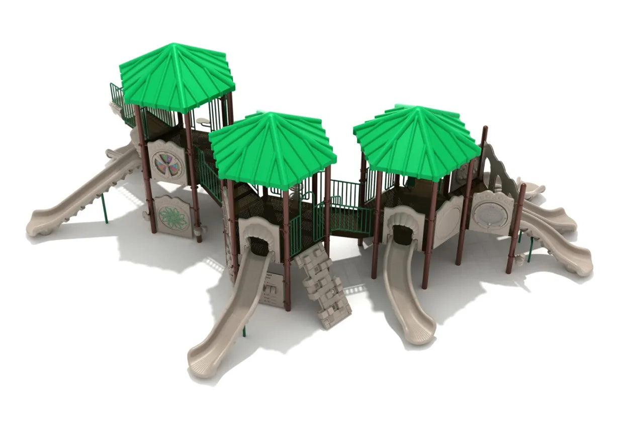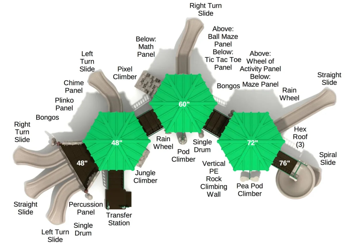 The Emerald Crest is a huge outdoor play structure encompassing slides, climbers and panels. Three Hex Roofs provide a sheltered space for kids to enjoy a variety of panels including a Tic Tac Toe Panel for fun games, a Ball Maze Panel to develop fine motor skills and problem solving, as well as a Math Panel for basic numeracy lessons. On one end of the Emerald Crest kids can enjoy a trio of slides to race with their companions, but there are also four other slides to be enjoyed on the structure including a huge Spiral Slide. Multiple ways to ascend the play system include a Pixel Climber featuring cubed holds, a Jungle Climber with a 3D relief of fun jungle animals, a Pea Pod Climber, a Pod Climber, and to top it all off, a large Vertical Rock Climbing Wall for adventurous kids. Around the base of the structure kids can encounter Bongos, Single Dum and a Rain Wheel, but there’s also a range of interactive fun panels including a Ball Maze Panel and Math Panel.