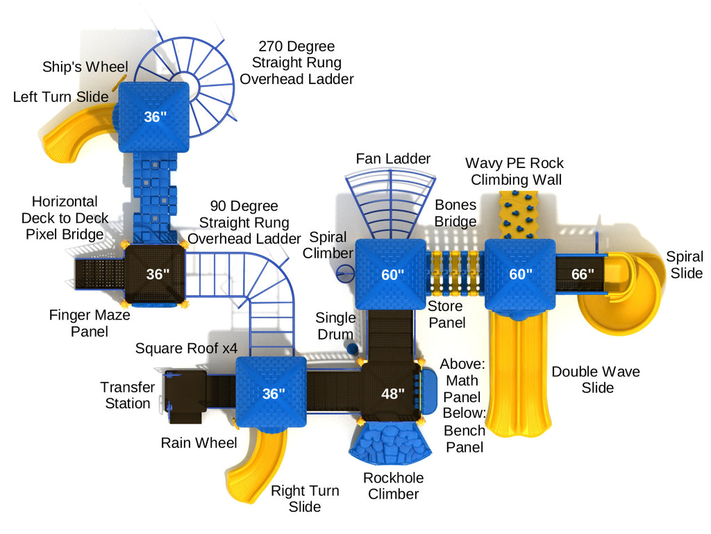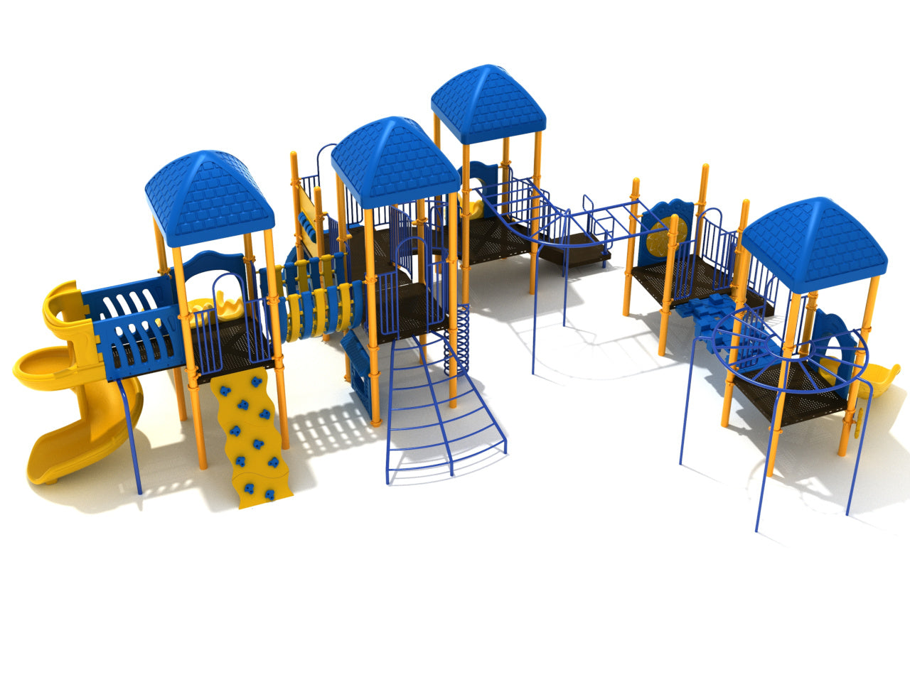 Esplanade Ridge is a play structure that resembles a small city filled with all sorts of adventures. With 5 slides and plenty of amenities, Esplanade Ridge is a must-have in every playground. Its design is of untamed landscape so kids can explore different interactive elements. They can hide beneath the Rock Hole Climber, pretending to camp in a cave. A Spiral Climber & a Wavy PE Rock Climbing Wall offer exciting yet challenging climbing experiences to young adventurers. So, they can make their way to the Bones Bridge, scrambling between climbers. Math, Bench, & Store Panels allow them to have fun with friends at various locations. 4 Square Toofs cover it all, making this play structure perfect for running around. The Finger Maze Panel adds to kids’ curiosity. Esplanade Ridge’s futuristic design invites children to hopscotch and develop their social skills while enjoying themselves. Since it is built with commercial-grade materials, this play structure provides safety and is sure to last for years to come.