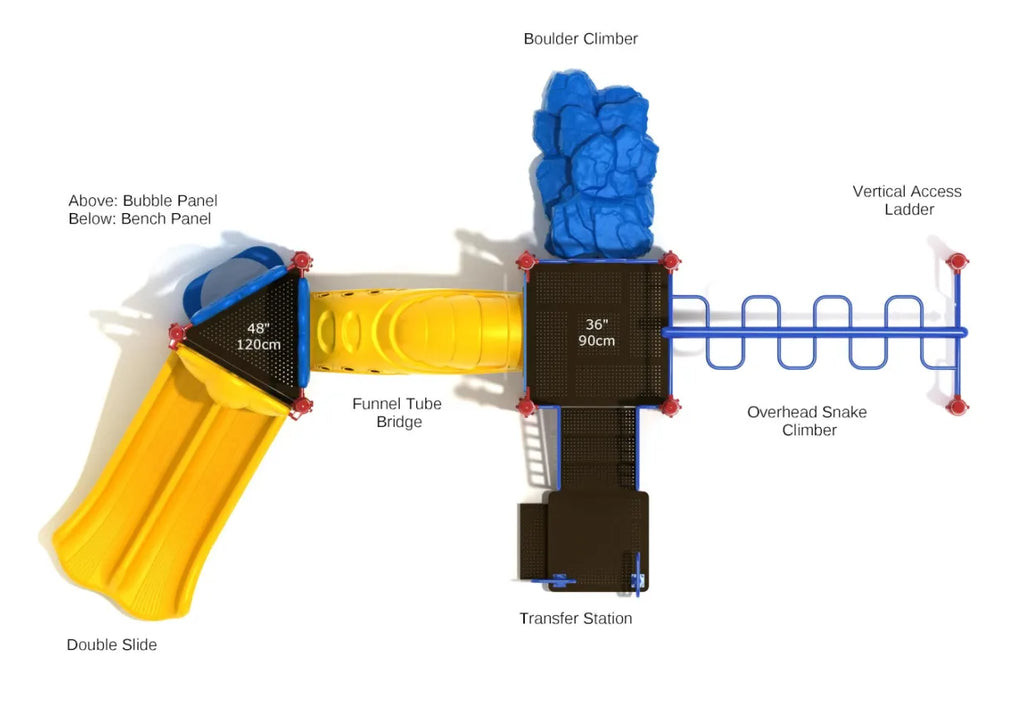 At Estes Park, kids can enter the structure via different climbing routes. The adventure starts as kids make their way up the Overhead Snake Climber to reach the top. Or, they may take the Vertical Access Ladder route for a more challenging climbing experience. There’s also a Boulder Climber that transforms little adventurers into brave mountaineers. Daring adventure lovers then take the Funnel Tube Bridge to explore different sections of Estes Park. The Bubble Panel lets them watch their friends engage in exciting adventurers all over the subtle play structure. When they get bored & exhausted, the Bench Panel becomes a comfy sitting lounge. Kids can talk about their shared experiences and bond over how much they enjoyed Estes Park. This structure’s design lets kids play outdoors & then rush inside to escape the wrath of the hot summer Sun. This play structure also enhances community playgrounds. So, local area kids can gather and engage in outdoor activities together.