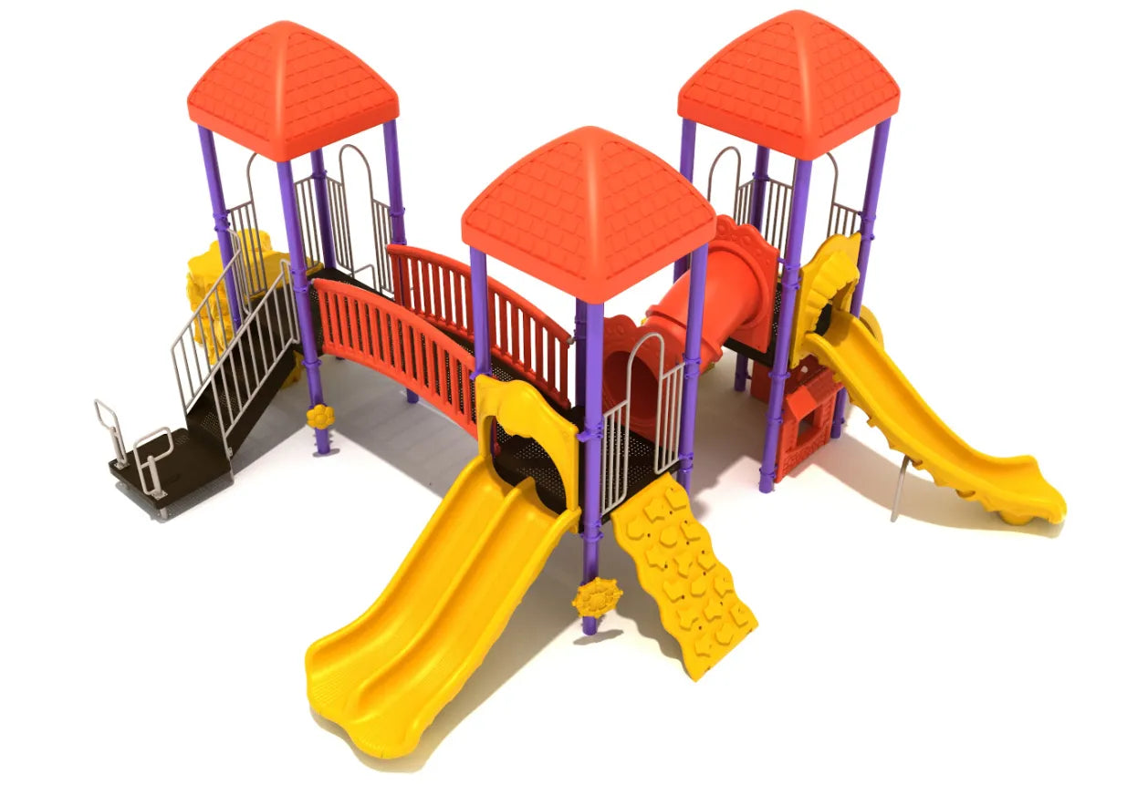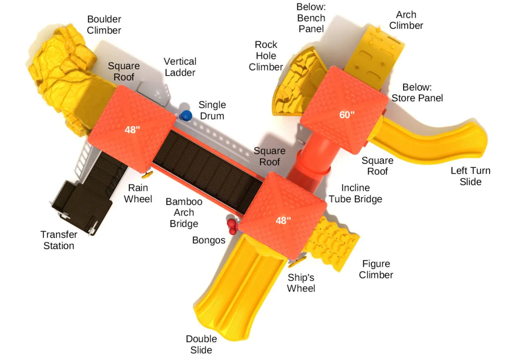 This play set is perfect for children who love to climb as it offers multiple chances to unleash the inner mountaineer. The Boulder Climber brings a different kind of challenge to the playground as there are no specific foot or hand holds like the Arch Climber or Figure Climber on the structure, but instead children have to scramble up and grab whatever they can to propel themselves forward. The Rock Hole Climber works on a similar principle and lets children choose their own way to the top just like a real-life mountain climbing expedition. From the top they can get down in an equally fun way using the Double Slide or Left Turn Slide. A large Bamboo Arch Bridge connects the two main Square Roofs and an Incline Tube Bridge connects the last section so children can go up or down it and pass each other too. The structure also benefits from a Bench Panel to sit with friends, a Store Panel to sell their imaginary products from and multiple music-making instruments such as the Single Drum, Bongos and a Rain Wheel.