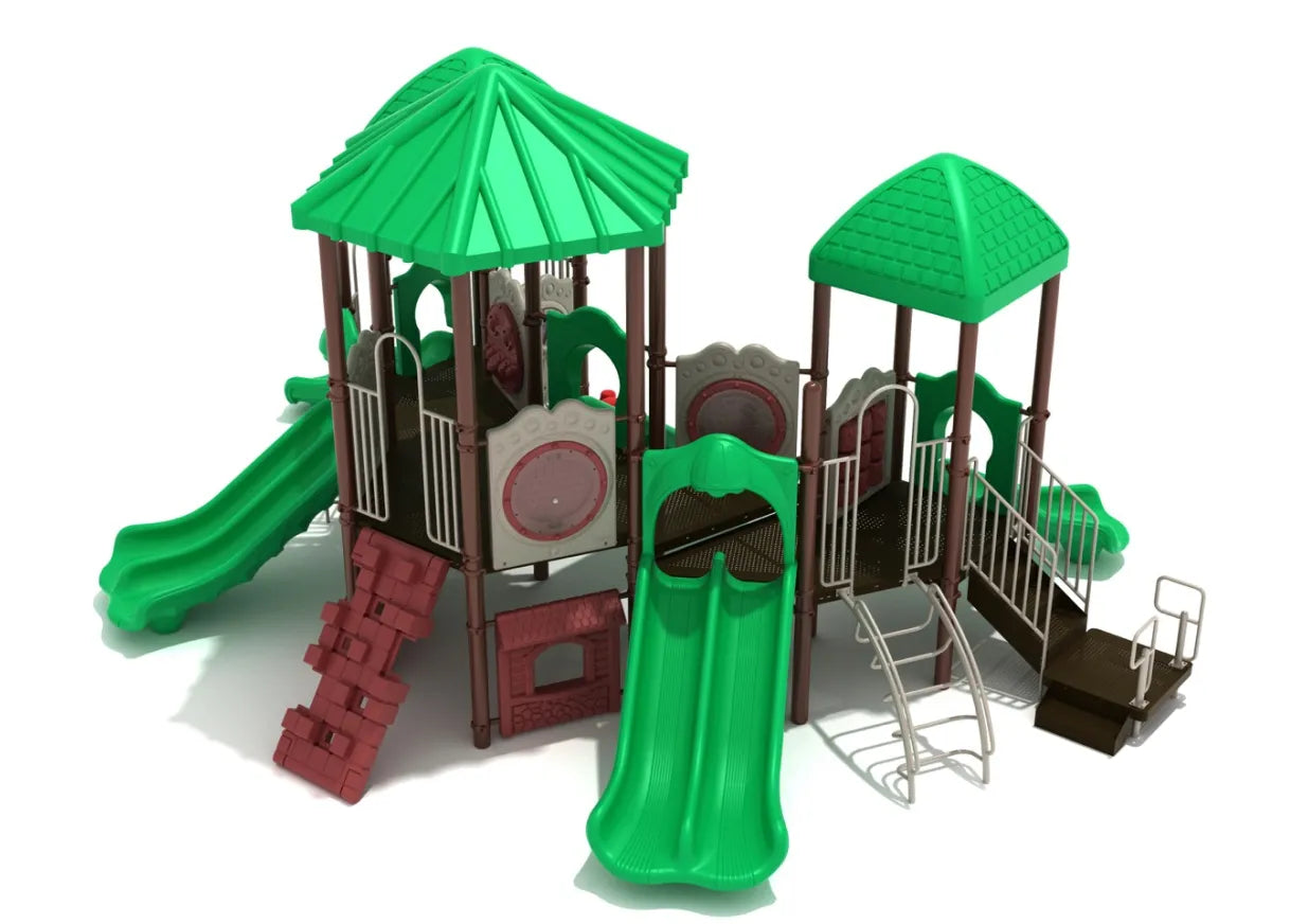 A main platform covered by a Hex Roof is the center of the play structure and two smaller decks with Square Roofs at the side each have lots of fun features attached. Two Double Slides mean 4 children can race each other to the bottom at the same time, and the addition of a Straight Slide, Wave Slide and Right Turn Slide means that whenever a child wants to slide there will always be a free option. Active and adventurous kids will enjoy the 3D cubes of the Pixel Climber to make their way up or down, a Spiral Climber offers a twisting adventure, and an Inverted Arch Ladder looks easy but requires lots of balance and hand-eye coordination to scale it. Kids with a musical persuasion will enjoy the Single Drum, set of Bongos and the varied Percussion Panel, whereas children who love to test their strategy can play on the Tic Tac Toe Panel with a friend or choose to defeat the Ball Maze Panel.