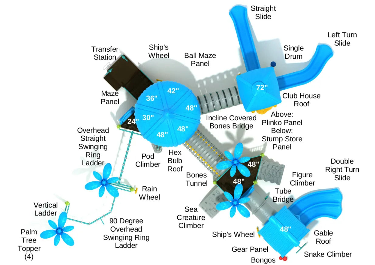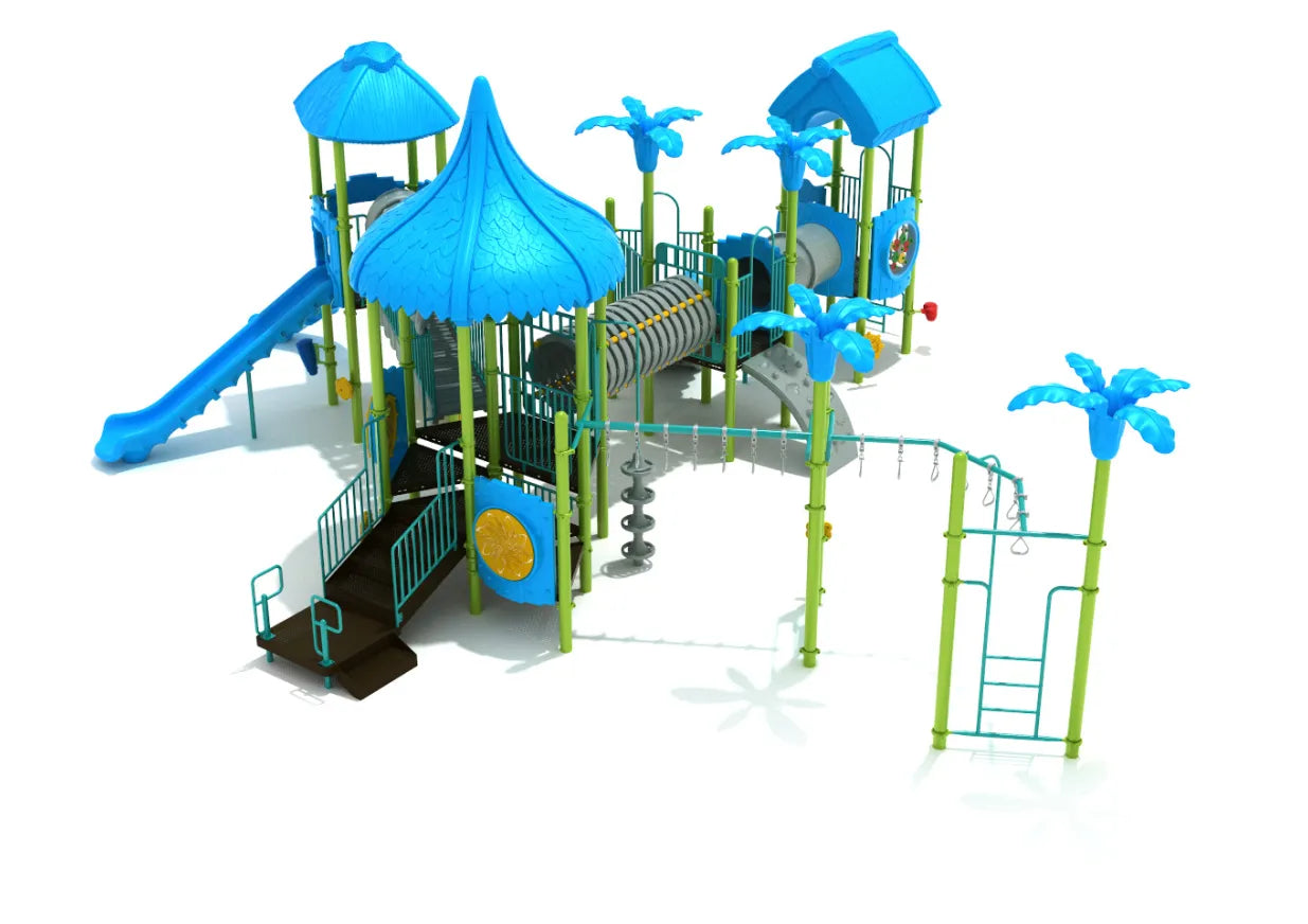 The Fancy Frog playground system is an ornate playtime palace that offers a range of captivating features and attractions, ensuring an enchanting playtime experience for children. Creating a sense of wonder and surprise, the Fancy Frog playground system encompasses a series of covered bridges that kids can cross to get from one attraction to the next, one of this product’s highlights. They will crawl into one end of each bridge and be happily surprised when they emerge on the other side surrounded by even more fun to be had!. Climbing options abound in the Fancy Frog playground system, starting with the double length of Overhead Swinging Ring Ladders that provide an athletically rigorous way to enter or exit the central platform with the Hex Bulb Roof. This eye-catching roof, along with the Palm Tree Toppers, completes the Fancy Frog’s exotic visual appeal. Children can also conquer the Sea Creature Climber or the Number Climber, showcase their agility with the Pod Climber, navigate the twists and turns of the Snake Climber, or just use the easily accessible steps of the Transfer Station. The Fancy Frog playground system also boasts a total of four slides for children to enjoy. This includes a thrilling Double Slide for those seeking tandem excitement as well as two exhilarating 6-foot-tall slides for more of a challenge. The Fancy Frog also boasts a multitude of interactive features. Help kids embrace their inner musician with two sets of drums, allowing them to discover rhythmic beats and explore their musical talent. Stimulate young minds and foster cognitive development with two types of Maze Panel, providing engaging puzzles and problem-solving opportunities. Let their imaginations run wild as they take hold of the Ship's Wheels, steering an imaginary vessel through imaginary seas. Kids can also spin the rain wheel, unleashing a symphony of tinkling water droplets that will delight the senses, or interact with the Gear Panel, offering a hands-on exploration of motion and mechanical principles. From the covered bridges and central platform to the climbing options, slides, interactive elements, and imaginative play opportunities, the Fancy Frog, made by QPC, ensures an enchanting playtime experience filled with fun, challenges, and endless imaginative adventures! What Are the Specifications of the Fancy Frog Playground System? The Fancy Frog weighs 6,000 pounds and is designed for children ages 5 to 12, accommodating up to 88 enthusiastic young adventurers. The playground system requires a use zone with a length of 56 feet and a width of 49 feet to ensure safe and unrestricted play, and the fall height is 84 inches. The posts have a diameter of 5 inches, providing stability and longevity Are There Any Related Products to the Fancy Frog Playground System? If the Fancy Frog play system isn’t quite what you’re looking for, we also have a few similar options that you should consider: Gecko Grotto Playground System Howler Hideaway Play System Bouncing Bobcat Playground System
