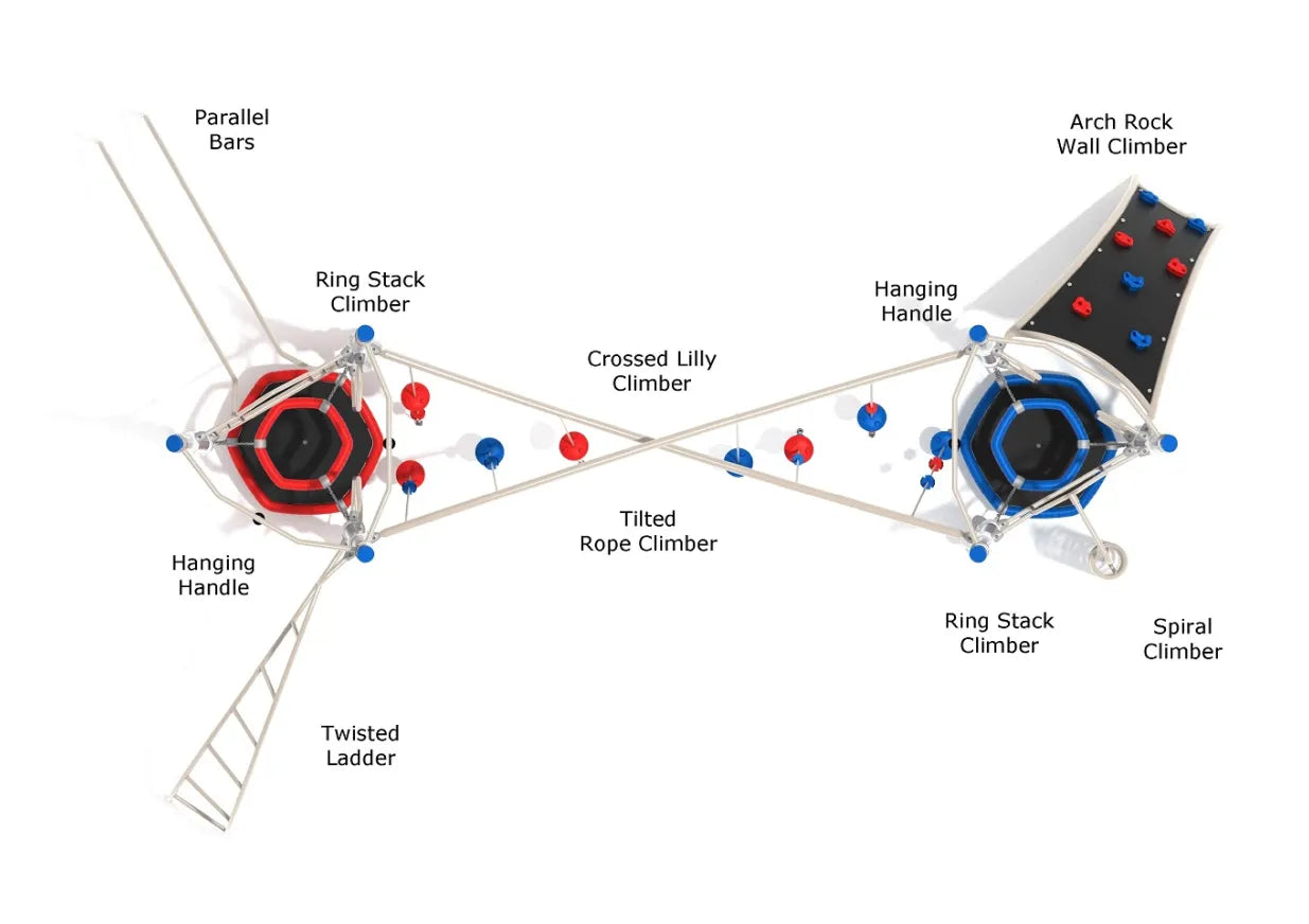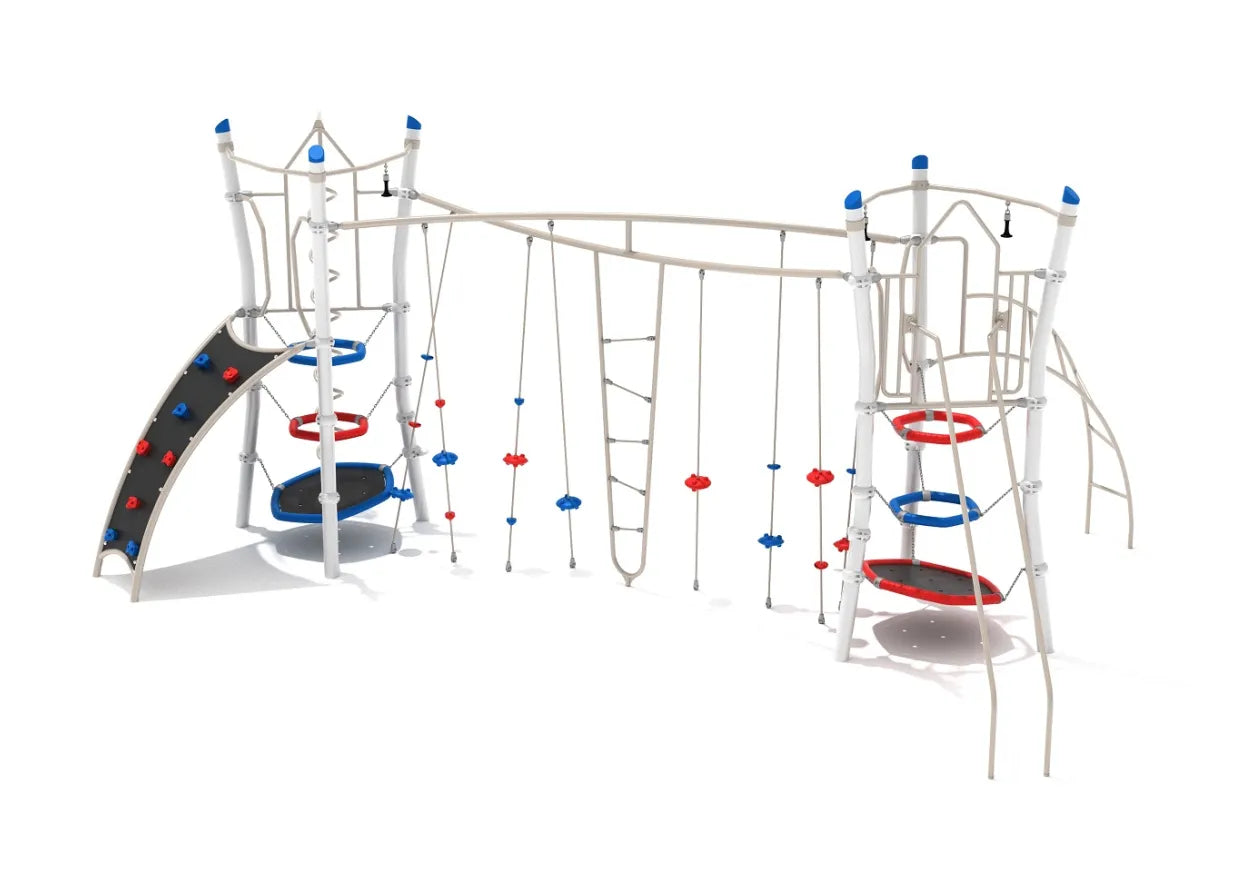 Fish River Canyon transforms any playground into a vertical obstacle course. Kids can scale the rock wall, navigate the rope bridge, climb pod steps, and finish with a climb down the twin-rail steel bars. Designed for ages 5–12, this high-energy climber builds upper and lower body strength, while improving balance, coordination, and confidence. Its flexible, open layout makes it ideal for group play and solo exploration alike.