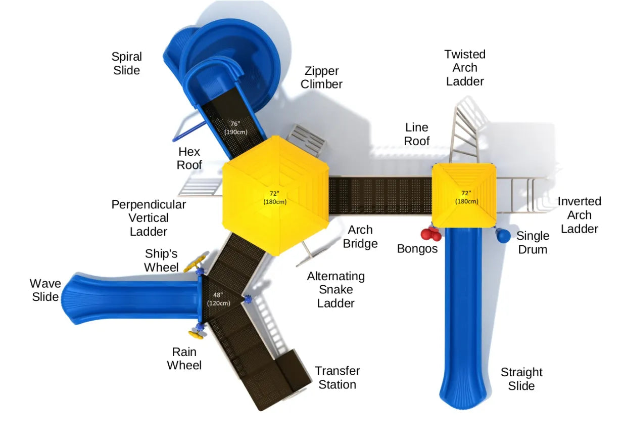 Kids can get bored quickly with typical playground equipment but the Fond du Lac kicks things up a notch and sits like a futuristic spaceship in your dedicated play area. Twists and turns can be found all over the structure which make kids rethink how they approach a certain piece of apparatus. The simple ladder has been reinvented five different ways to provide mental and physical stimulation. A Twisted Arch Ladder and Inverted Arch Ladder require kids to twist their body in uncommon ways to succeed, and the Zipper Climber and Alternating Snake Climber have a unique layout that kids will love to experiment with. A Perpendicular Vertical Ladder allows children to make use of sidewards movements to reach the platform where even more fun is to be had. Three slides await adventure seekers, a Spiral Slide, a Wave Slide and one very long and high Straight Slide. An Arch Bridge connects the two structures under a large Hex Roof, and on the lower level kids can play with Bongos, a Single Drum, Rain Wheel and a Ship’s Wheel which spins freely.