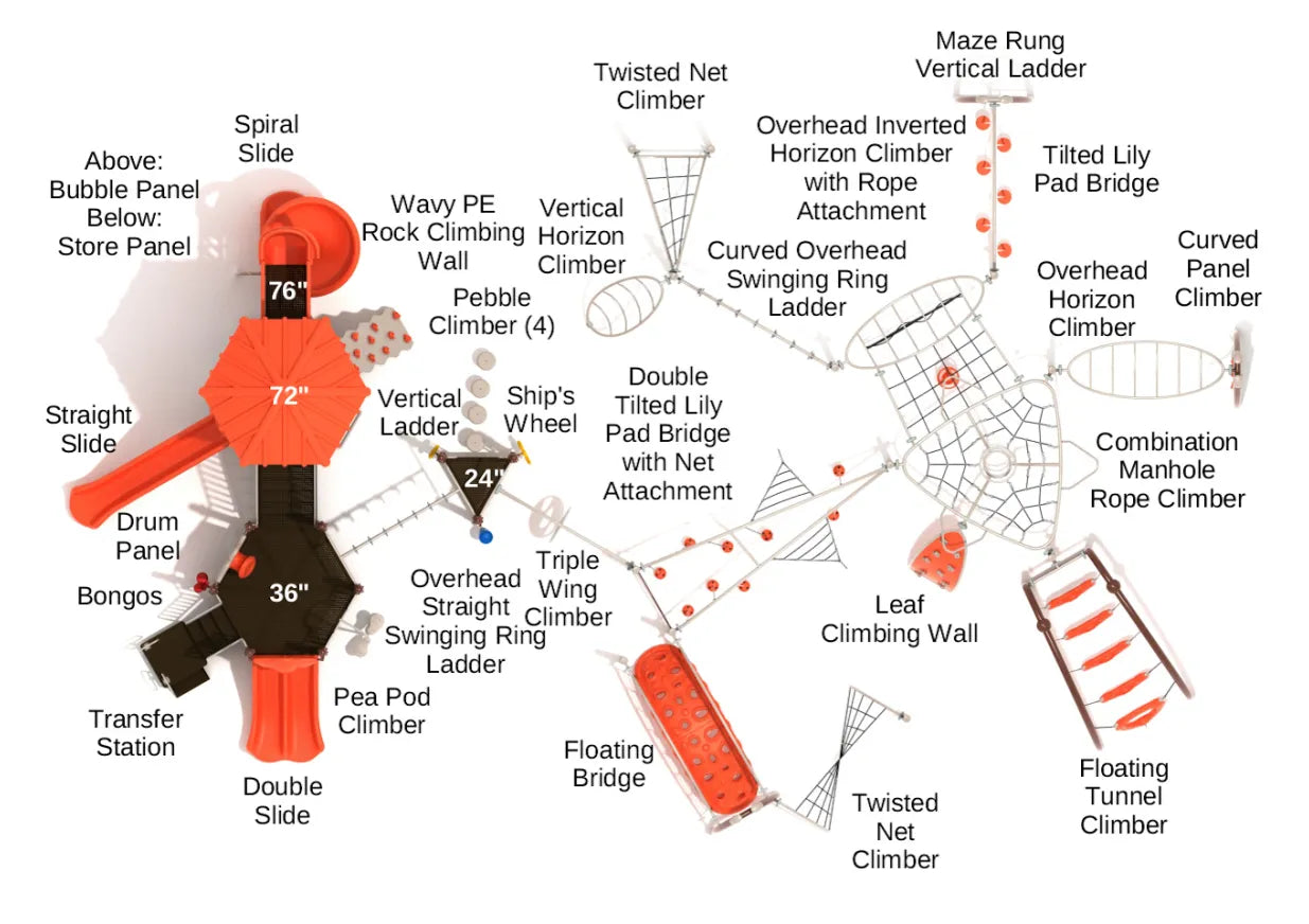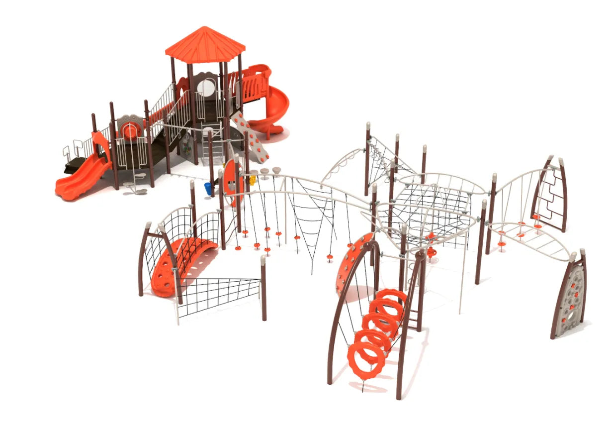 Standing at a fall height of 96”, the Foxcliff Trace isn’t just your average playground. It’s an adventure zone that turns playtime into action-packed experiences with its ladders and climbers. The Pebble Climber and the Wavy PE Rock Climbing Wall become excuses for vigorous exercise, leading to muscle development. The Floating Bridge and the Curved Panel Climber let kids enhance their endurance, coordination, and agility. Thanks to the Leaf Climbing Wall and Twisted Net Climbers, children can climb like monkeys from one obstacle to another, as if they’re floating in midair throughout the journey! They can even bet to see who finishes exploring the Foxcliff Trace without ever touching the ground. It is good for their upper-body strength! Also, a 76-inch Spiral Slide serves as a very rewarding endpoint for those who navigate all climbing challenges successfully. The Bubble and Store Panels provide options for relaxation after a healthy playtime. Foxcliff Trace accommodates kids of all abilities.