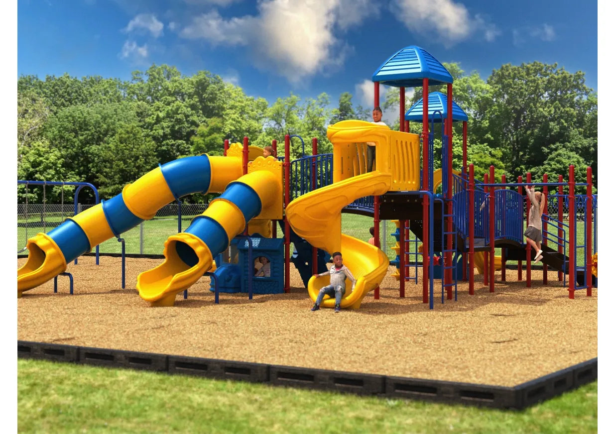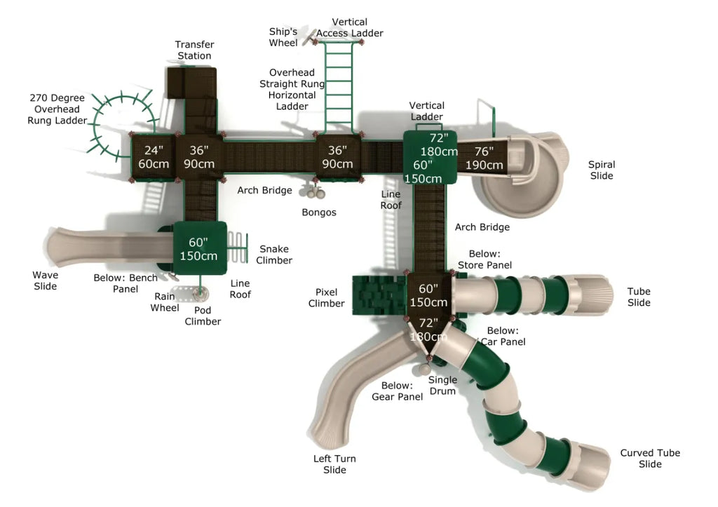 With multiple climbers, slides, and activities, the Galveston play system is no less than a playground paradise for kids. First off, climbers like Snake Climber, Pixel Climber, and Pod Climber are there to challenge the strength of kids and build their upper body muscles. The deck is very spacious and big, so kids can walk between multiple bridges and say hello to their partners or parents while enjoying the overall experience. After getting up on the deck through climbers, kids can choose between a range of slides to come down, including Wave Slide, Spiral Slide, Left Turn Slide, Simple Tube, and Curved Tube Slide. The fun does not stop here! The 270-degree overhead rung ladder adds to the fun and lets kids swirl like monkeys to complete the play-loop structure. No matter what, adventure and thrill are always there in Galveston. It can accommodate up to 94 children at once.