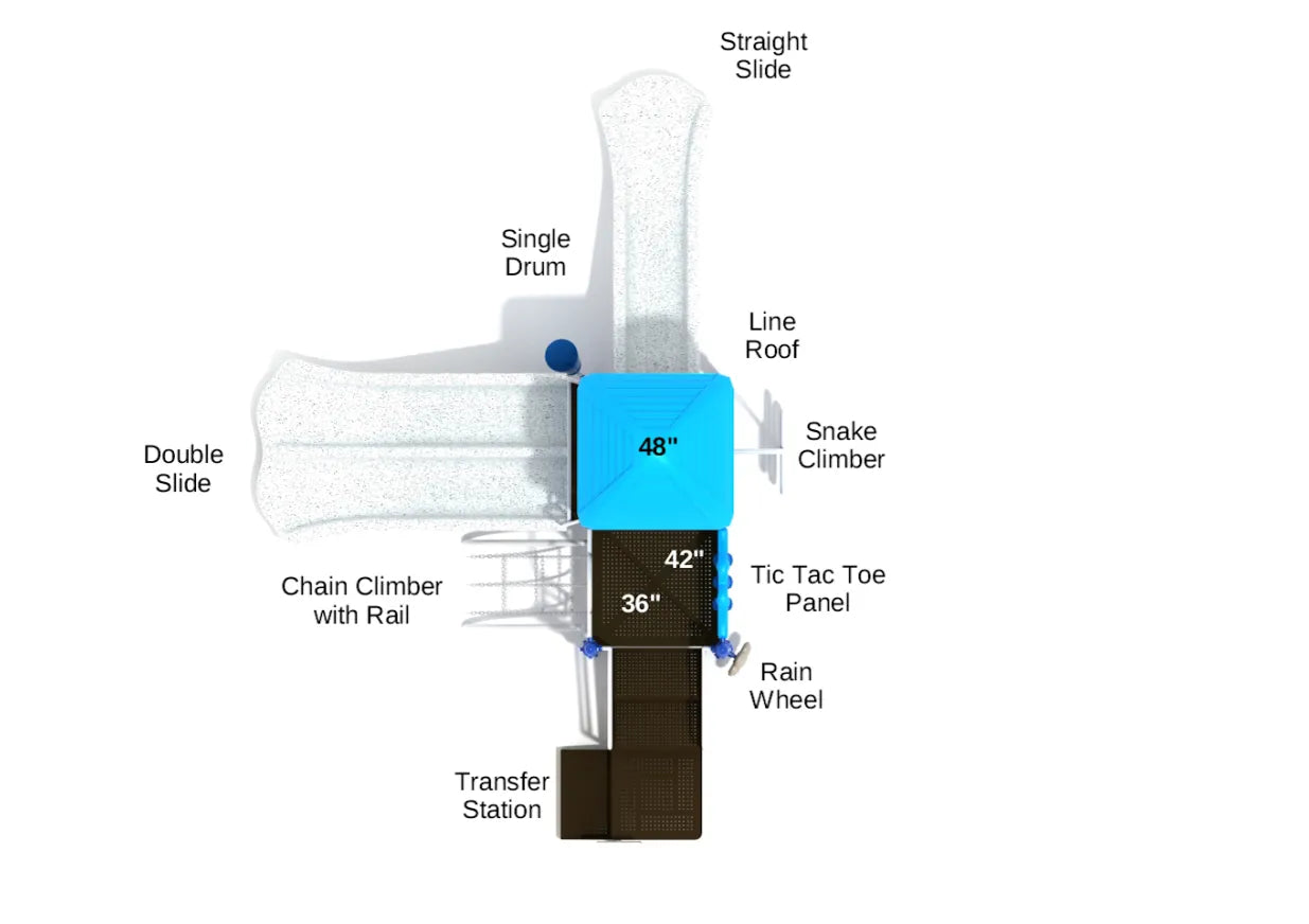 The Gardiner is an accessible play structure suitable for kids of all abilities thanks to the addition of a Transfer Station. This means children with mobility aids and wheelchairs can enjoy the fun too, and younger children who aren’t ready to tackle equipment like the Chain Climber with Rail can get to the upper platform easily. A Snake Climber provides a great alternative to straight vertical ladders and children will love climbing up the outside or inside of it and then transitioning themselves to the platform. On the top there’s a Tic Tac Toe Panel for a friendly yet competitive game, and on the lower level a Rain Wheel can be spun to create the sound of a tropical rainstorm. There’s also a Single Drum attached to the pole underneath the slides which is sure to invite lots of music-making. A Straight Slide is available for kids to shoot down at speed on their own, and the Double Slide provides the opportunity for two kids to use it together.