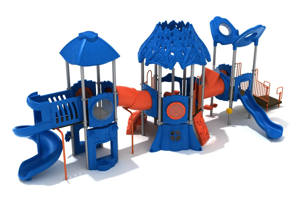 It’s not often you see play equipment with so much potential for adventure, but that’s exactly what the Gecko Grotto delivers. To get from the outer platforms to the central hexagonal platform with a huge and leafy Hex Tree Roof, kids have to make their way through an Incline Tube Bridge or a Tube Bridge with Window. There are 2 Banana Toppers with Windows towering above the platform with a Straight Slide emerging from below, as well as a Maze Panel to trace around a magical forest flower and a Double Drum to pound some beats on. Either side of the main central platform, there’s a Rock Hole Climber featuring a cascade of fallen rocks, and a Jungle Climber which has a 3D relief of jungle animals poking out from behind a wall of leaves. A Double Slide flows from underneath the giant roof, and a Spiral Slide can be found attached on the end of the structure for some twisting fun.