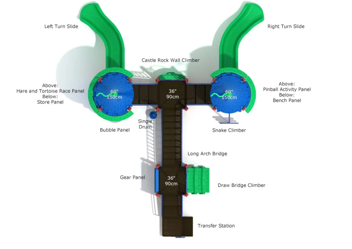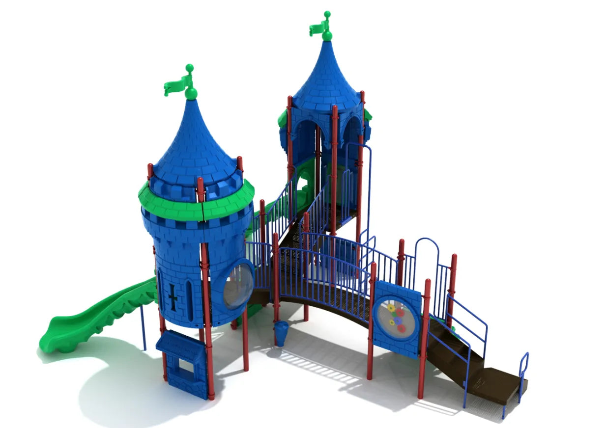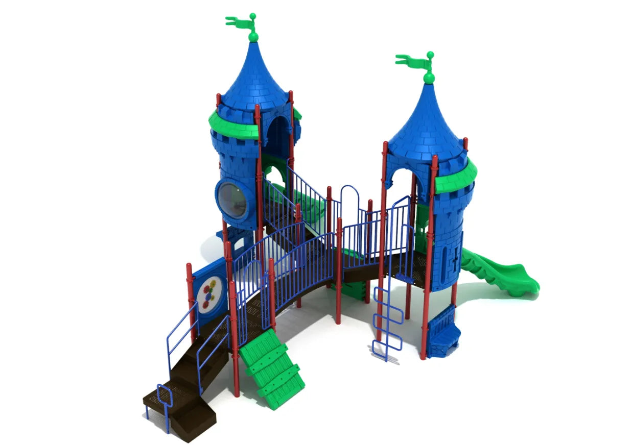 If there was a playground masterpiece in terms of symmetry, it would be the Gilded Towers. The setup has two towers of equal height, the same attractive Castle Roof and Walls, and a slide going down from both. Kids can also enjoy the Gilded Towers without climbing it, thanks to the activity panels below. There’s a Store Panel where kids can roleplay a store owner and customers. Under the other tower, there’s a Bench Panel for kids taking a breather or waiting for their friends to arrive before they start playing. There’s also a Single Drum which young artists with a likening of music would love beating. Ground-level amenities aside, the real fun is above the playset. To get up there, there are easy and inclusive Transfer Station stairs and three challenging climbers, the Draw Bridge Climber, Snake Climber, and the Castle Rock Wall Climber. Kids have activities such as Gear Panel, Hare and Tortoise, and Pinball. The Right Turn and Left Turn Slides will also be their favorite activities.