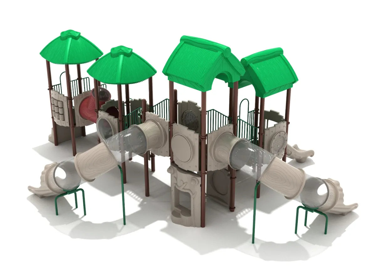 Kids will be excited to get on the Gorilla Gorge and experience everything it has to offer. As if one Right Turn Tube Slide wasn’t enough, the addition of a second Left Turn Tube Slide will have kids racing to try them both out. The parts of the slide alternate between transparent sections and a plastic molded wood grain to maintain the forest theme. This is complemented by various woodland and jungle-themed components such as the Stump Climber which appears to be trees cut down and ready to climb on, a Tube Bridge with a Window that also sports the wood grain styling, and two Stump Store Panels so children can exercise their imagination and sell their jungle goodies. A Jungle Climber places them among forest animals poking out of the leafy undergrowth, and once they’ve reached the top they can slide down the Straight Slide like a waterfall or choose to entertain themselves on a Tic Tac Toe Panel, Ball Maze Panel, Math Panel or colorful Gear Panel.