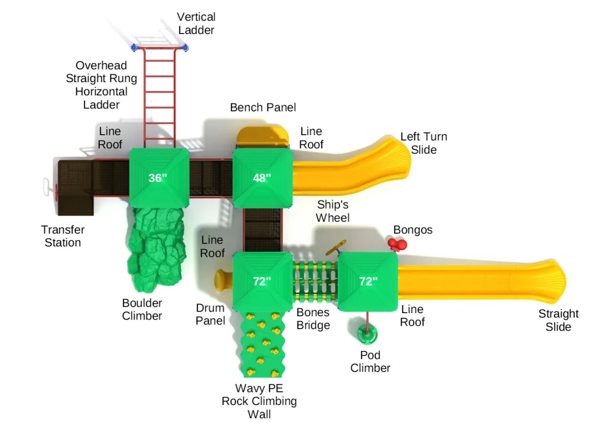 When you need outdoor play equipment to entertain around fifty children at the same time in a playground or park, choose the Greenville play structure. Kids can choose a rocky mountain path on the Boulder Climber or use their strength and agility to climb up using the Rock Climbing Wall with multiple holds. The Pod Climber offers a different experience and needs careful coordination to climb, or they can swing in the jungle on the Overhead Straight Rung Horizontal Ladder accessed by a small Vertical Ladder. As they work their way through the Greenville underneath four Line Roofs to protect from the sun and rain, children can cross the wobbly Bones Bridge before experiencing the twists and turns of the Left Hand Slide or head down the speedy Straight Slide. There’s a Drum Panel and Bongos that children can hit to make deep tribal sounds which add to the atmosphere of the playground, and a Ship’s Wheel for taking others on ocean adventures. The Bench Panel offers a place to sit and relax before deciding which fun activity to enjoy next.