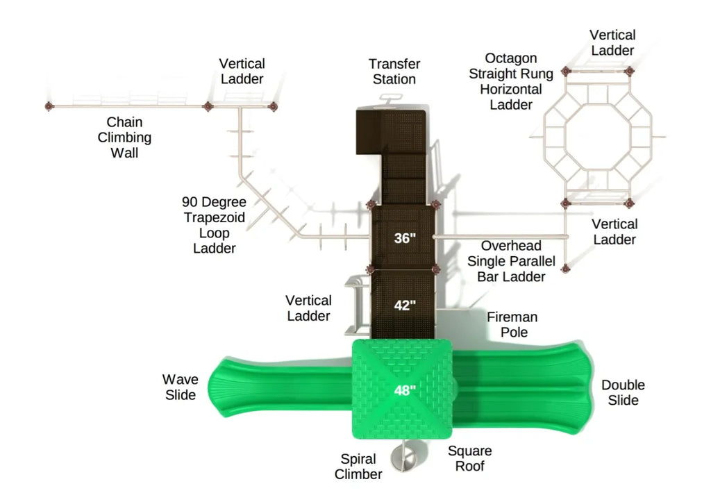 The Grosse Pointe play system has almost everything a kid needs to build their upper body strength and coordination and have fun while at it. While there is a Double Slide and a Single Wave Slide in this structure, they are not the highlight. The highlight is all the Ladders this play system comes with. Kids who just want to enjoy the slides can get up the deck through the Transfer Station and have at the slides. But kids who prefer a challenge can start from either the Chain Climbing Wall or the Octagon Straight Rung Horizontal Ladder. The Climbing Wall leads to the 90-degree Trapoziod Loop Ladder, which ends at the deck, and the Horizontal Ladder leads to the Overhead Single Parallel Bar Ladder, which also ends at the deck. If there is still some energy left, there's also a Fireman Pole, which kids can enjoy during their playtime.