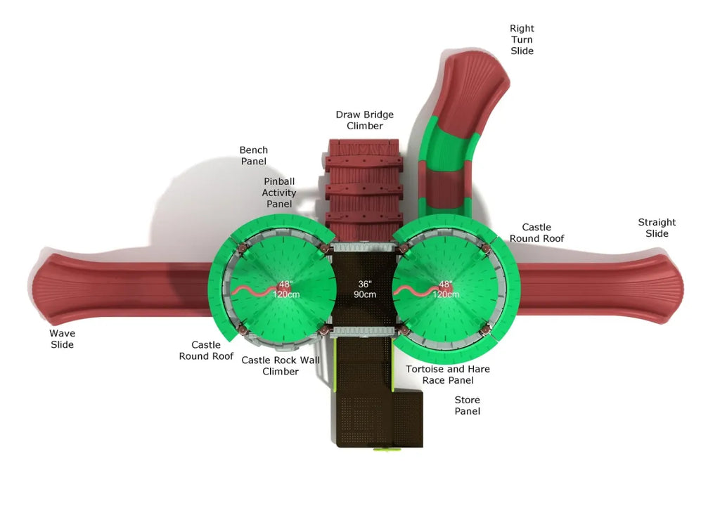 Children don’t just come to playgrounds for adventure. They also want to socialize, meet their friends, and catch up. This Hemyock Halls playground set presents the perfect opportunity to do just that. It promotes fun, adventure, and social play. It looks like a castle from the Medieval Times. This would surely make your playground more unique. On the ground level, kids will find a Bench Panel and a Store Panel. Here, they may rest or exchange stories with their friends. The Store Panel is also great for playing imaginative games. Underneath the Hemyock Halls, there’s another cool, shaded spot for them to relax during the hot days. For more fun-filled activities, children can climb to the top of the structure via the Draw Bridge Climber or the Castle Rock Wall Climber. On the elevated platform, kids will find a Hare and Tortoise Race Panel and a Pinball Activity Panel. They can play games there and then take a ride down one of the three thrilling slides attached to the structure.