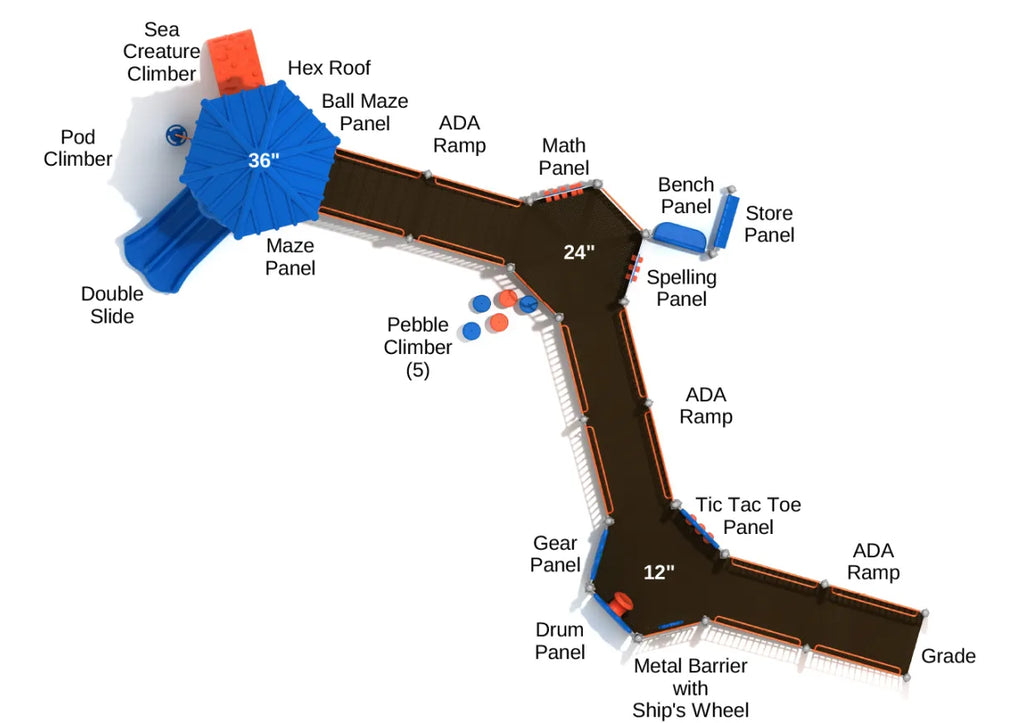 The High Sierra is a fantastic way for children of all ages and abilities to play together on the same equipment thanks to the three ADA Ramps that make up the structure. On one end of the play set there’s a Sea Creature Climber featuring starfish and jellyfish that can be grabbed to make their way to the top, or kids can use the slightly more difficult Pod Climber to reach the platform too, topped by a large Hex Roof. From here they can play with the Ball Maze Panel or whoosh down the Double Slide on their own or with a friend. Approaching from the other direction, wheelchairs and mobility aids can enter the High Sierra, and for children who just need a bit more support there’s the reassurance of metal railings on both sides. As they work their way along the ADA Ramps, they can enjoy a game of Tic Tac Toe, spin the Gear Panel and watch the colors twirl, or be the captain of their very own ship on the Metal Barrier with Ship’s Wheel. On the ground level there’s a Pebble Climber set to test their balance on, and a Bench Panel next to a Store Panel where they can engage in some shopping role play.